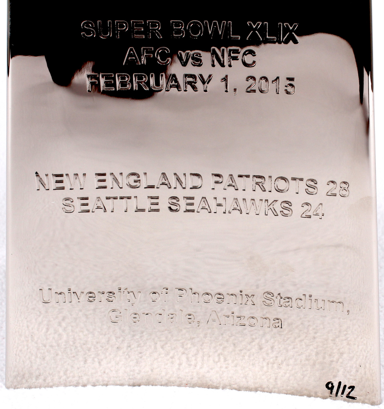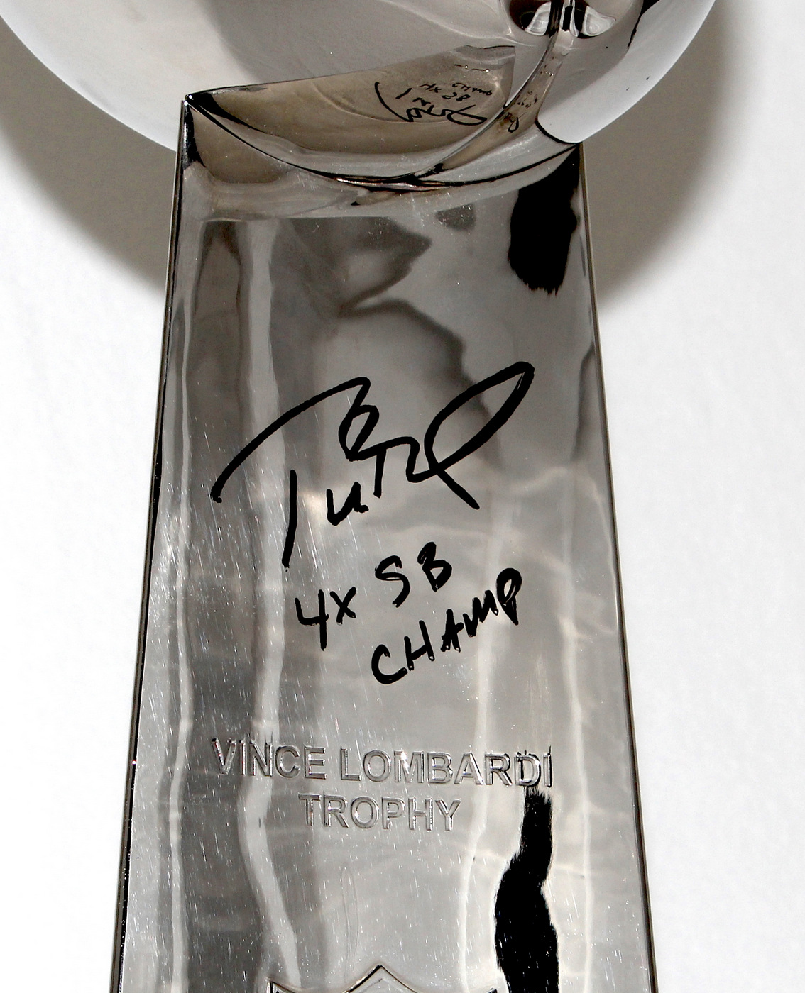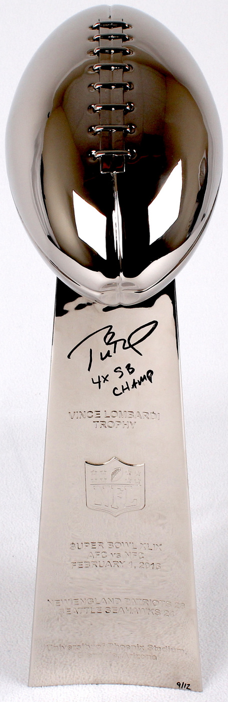 Full size replica Super Bowl XLIX Lombardi trophy measures 22" in height and is hand signed and inscribed in black felt-tip pen by Tom Brady (Patriots). Limited edition hand-numbered 9/12.