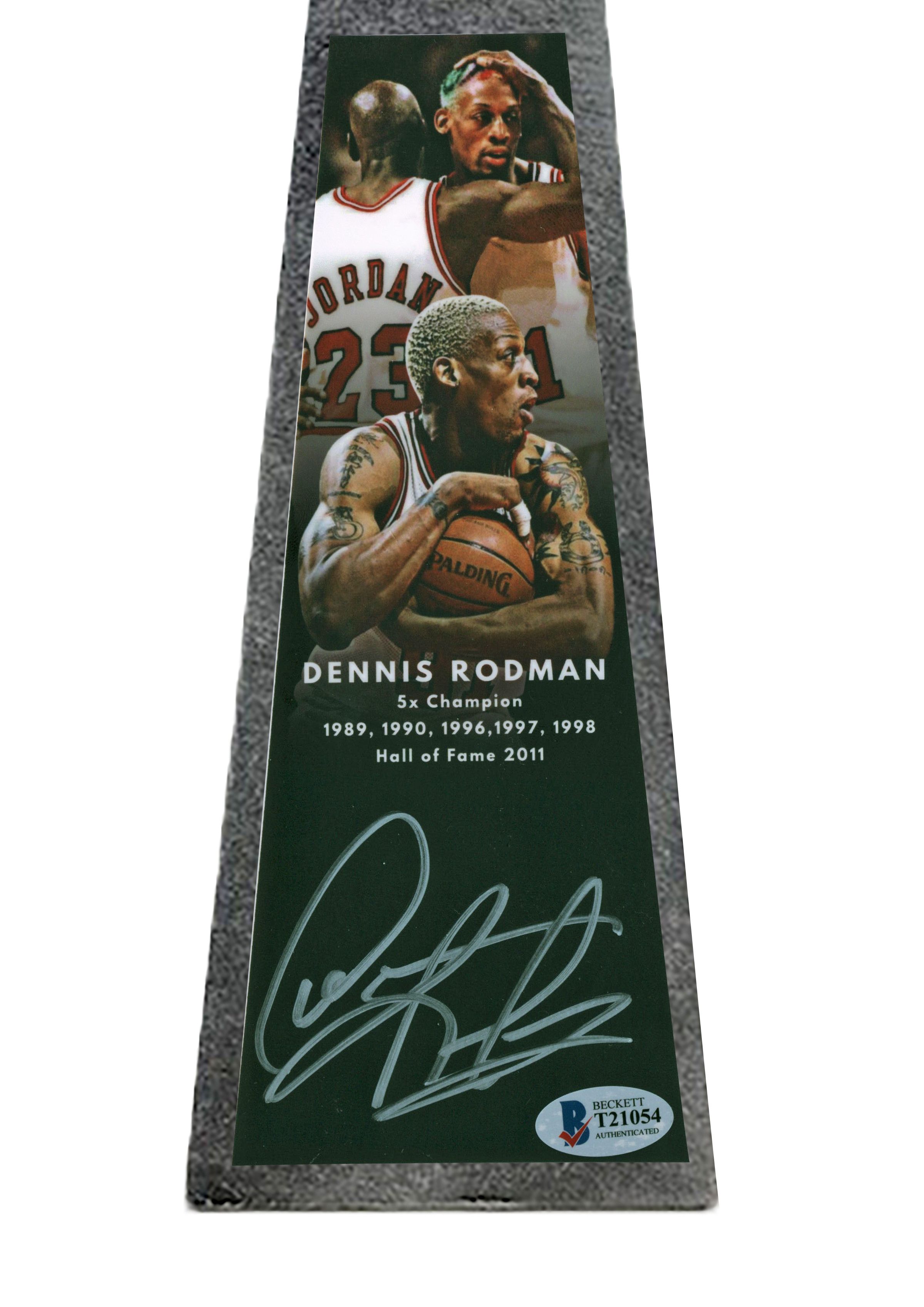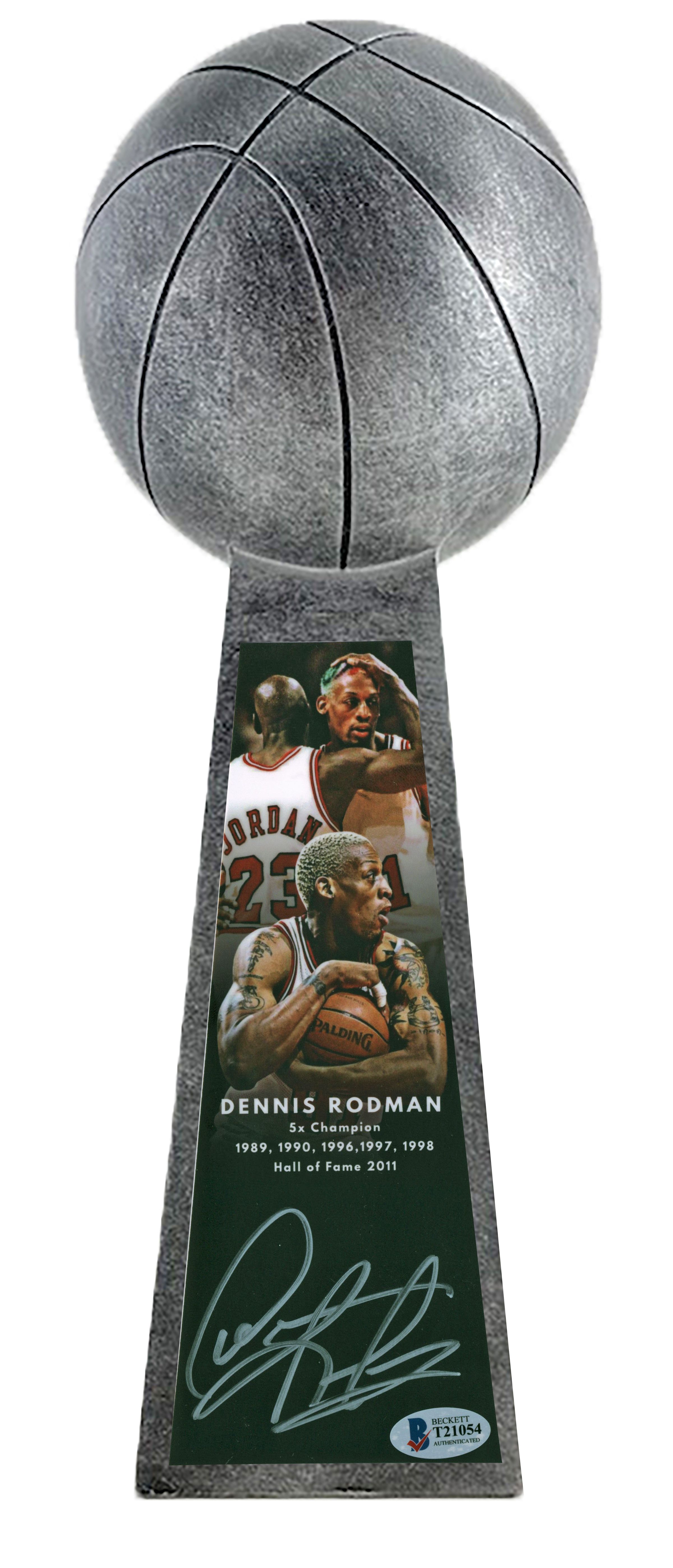 Replica championship basketball trophy measures approximately 14" in height and has been hand-signed in silver paint pen by Dennis Rodman (Chicago Bulls, HOF).