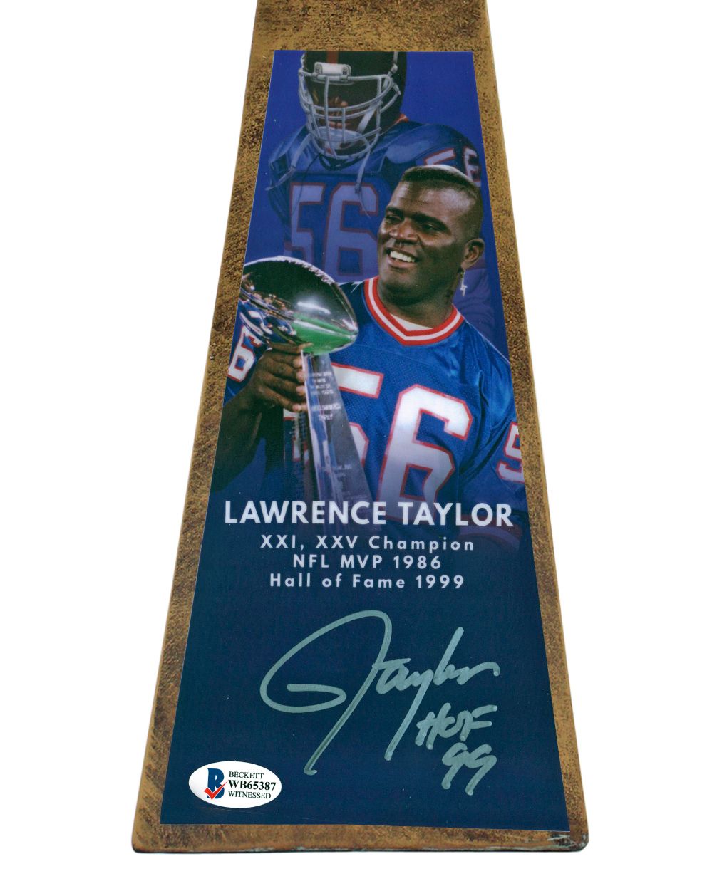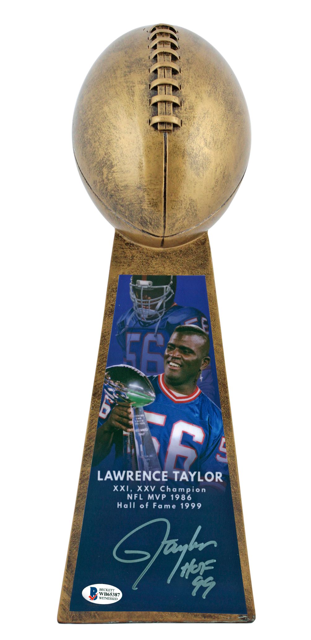 Trophy measures approximately 15" in height and has been hand-signed and inscribed in silver paint pen by Lawrence Taylor (New York Giants, HOF).