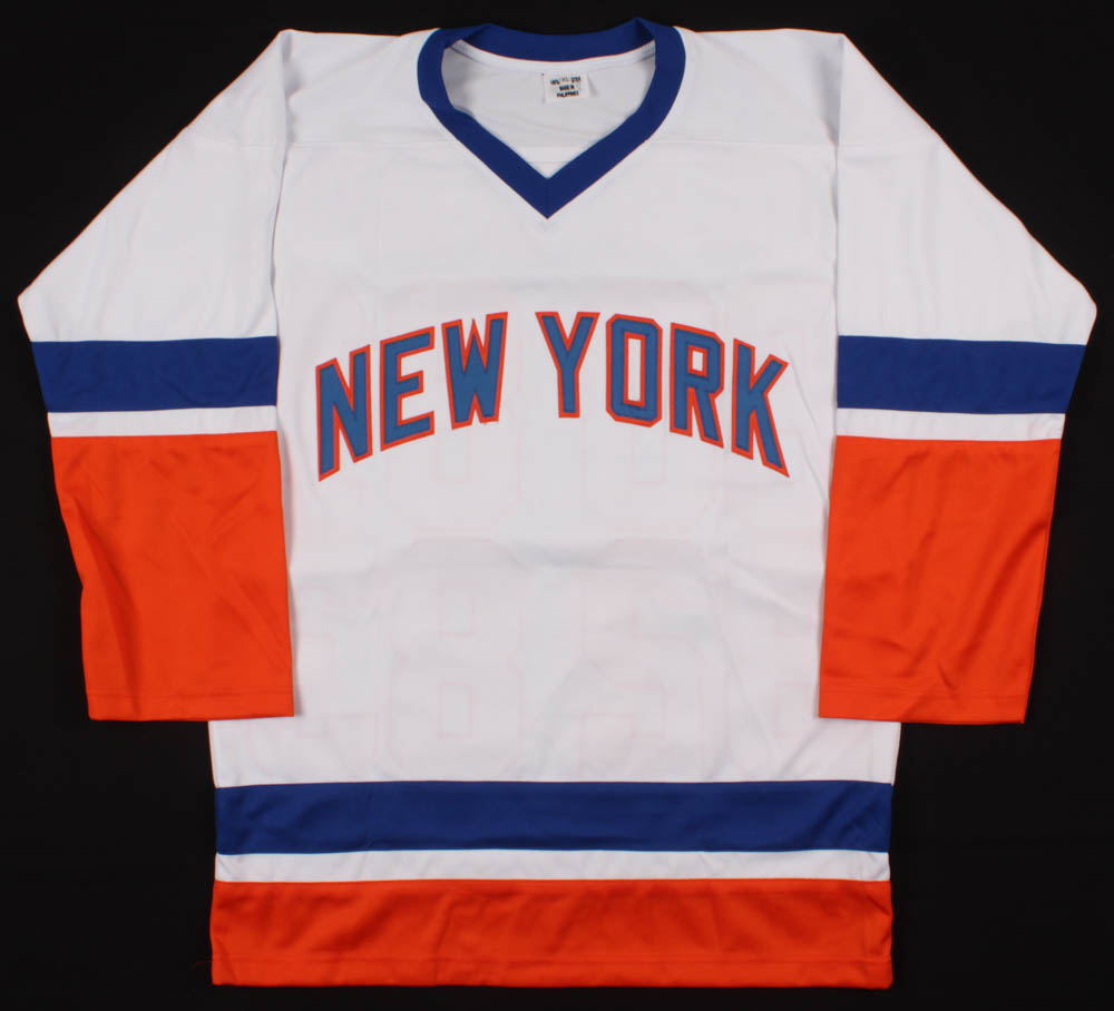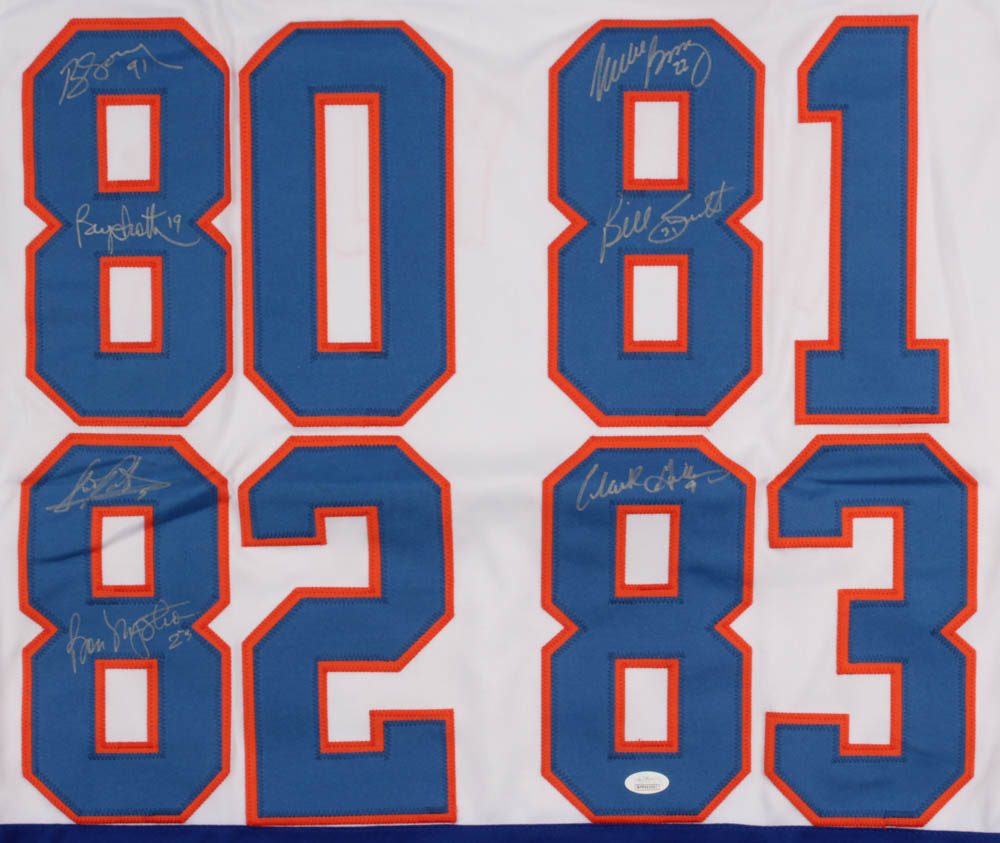 Custom on-ice style jersey. Everything is sewn on, size XL. Hand-signed in silver paint pen by Denis Potvin, Bob Nystrom, Billy Smith, Butch Goring, Bryan Trottier, Mike Bossy and Clark Gillies.