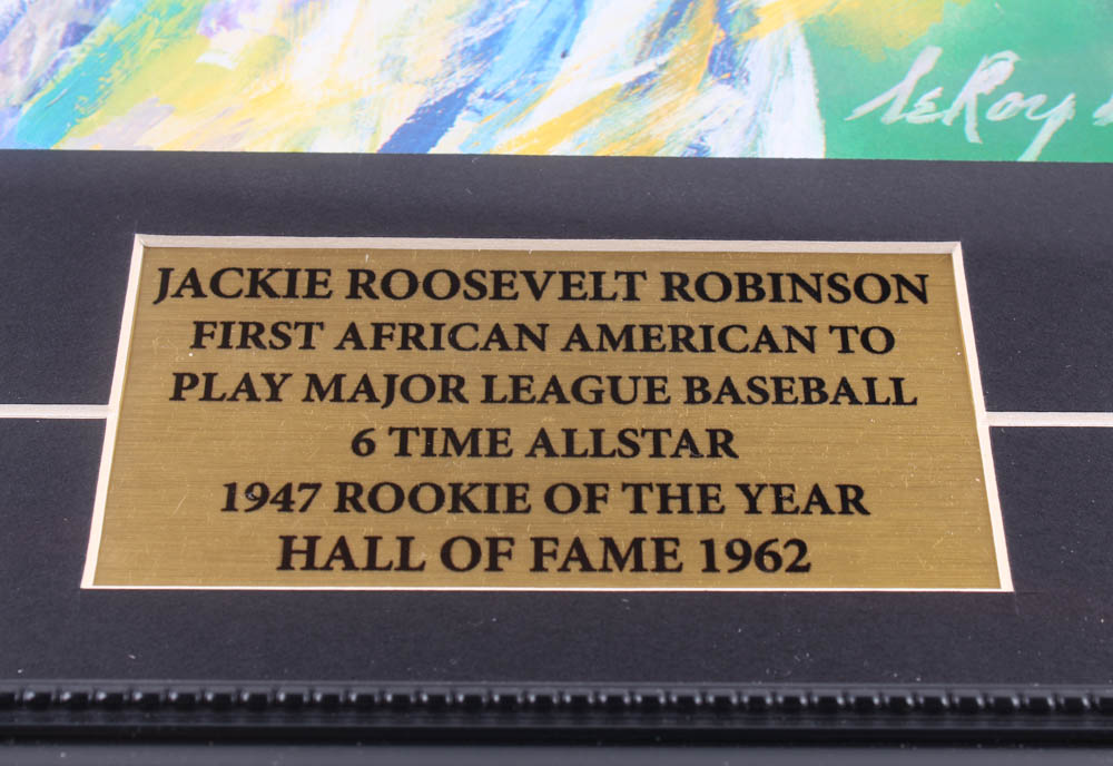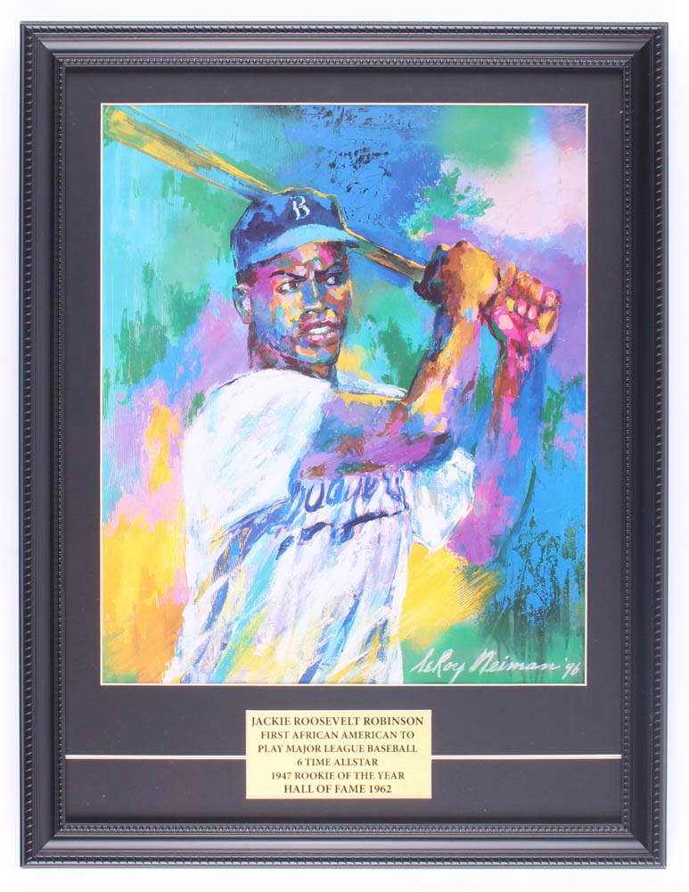 Custom frame measures 15.25" x 19.75" in size and features a LeRoy Neiman print of Jackie Robinson (D. 1972, Brooklyn Dodgers, HOF).