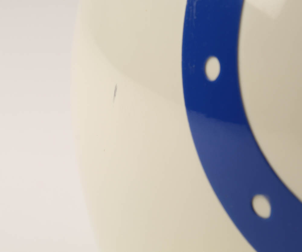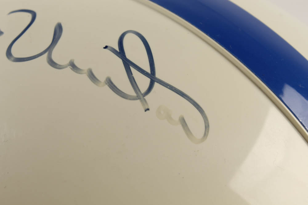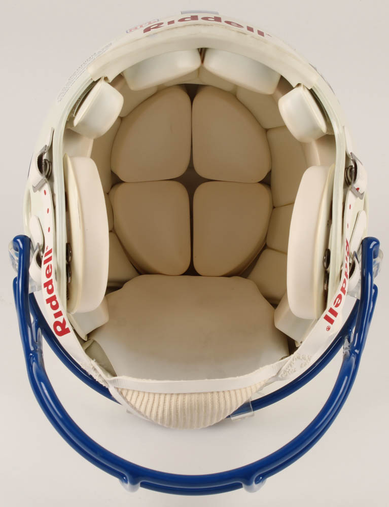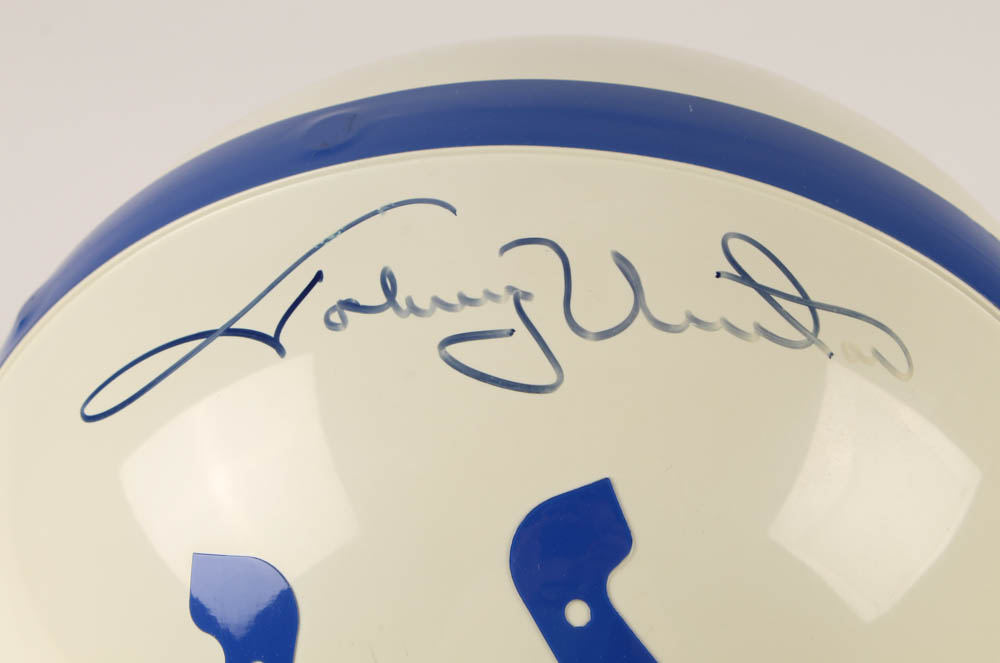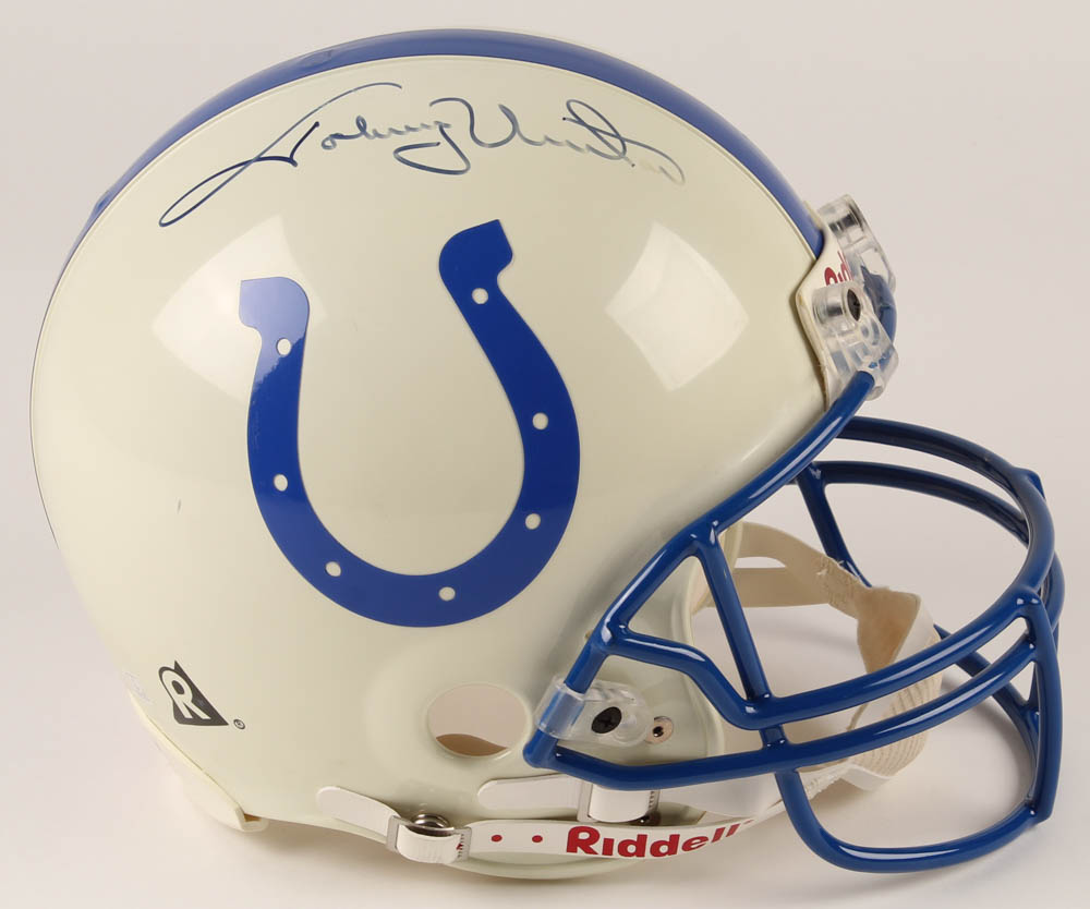 Riddell Baltimore Colts authentic on-field full-size helmet. Hand-signed in blue felt-tip pen by Johnny Unitas (D. 2002, Baltimore Colts, HOF). Please see photos for details regarding the condition of the helmet.