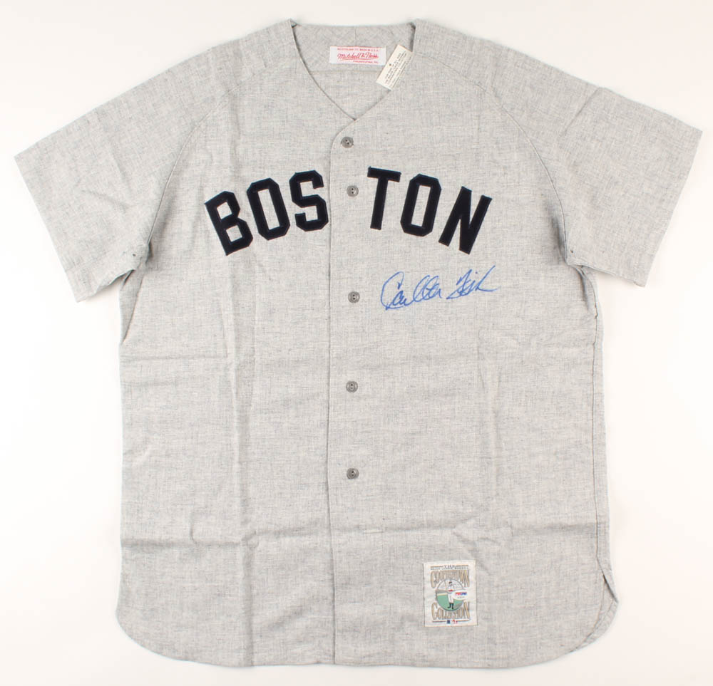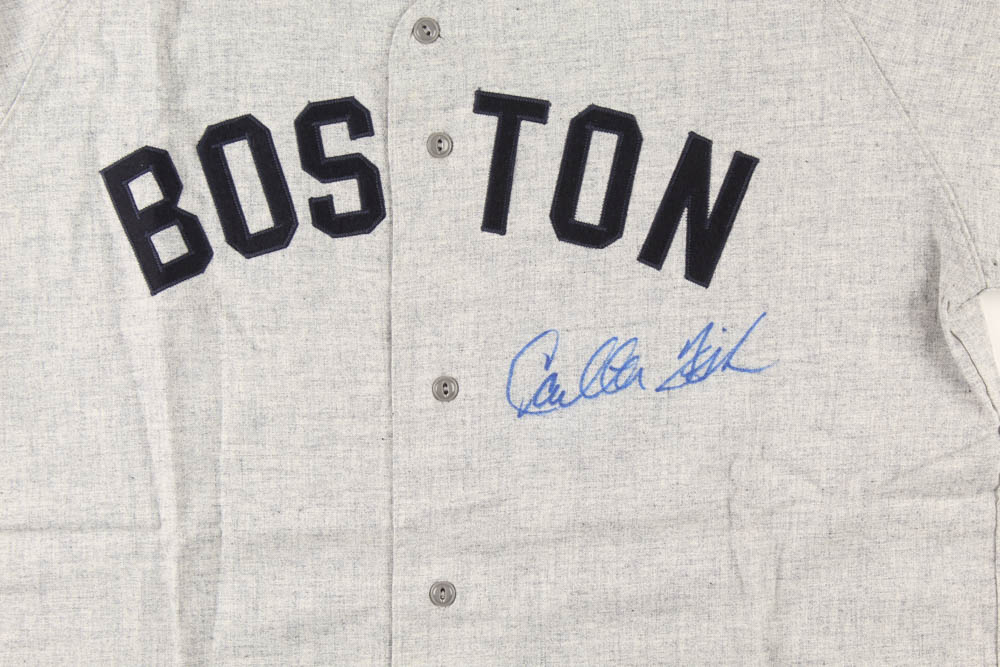 Mitchell & Ness on-field style jersey. Everything is sewn on, size XL. Hand-signed by Carlton Fisk (Boston Red Sox, HOF).