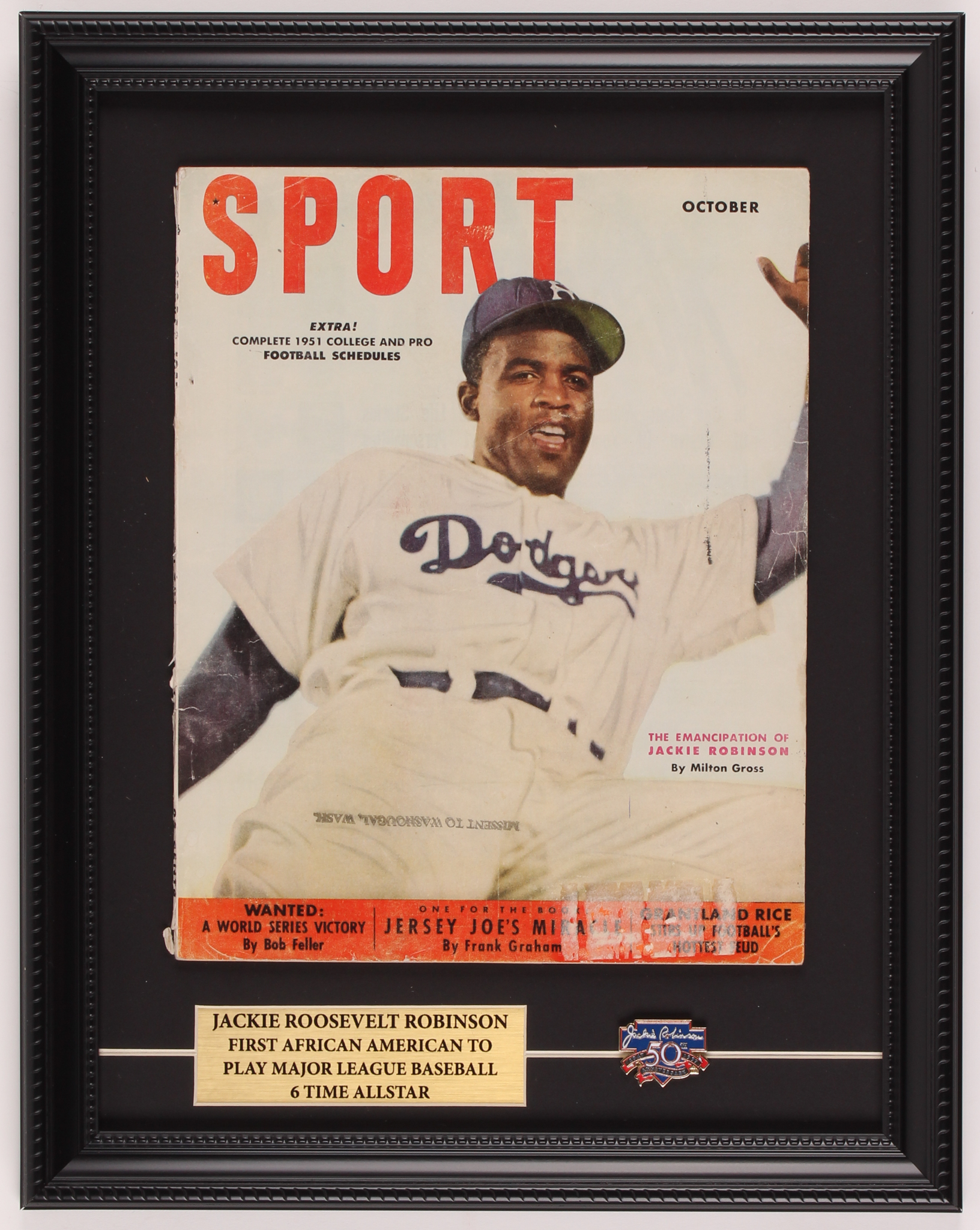 Custom framed display measures approximately 12" x 16" in size and features an original October 1951 issue of "Sport" magazine. Display also features a Jackie Robinson pin.