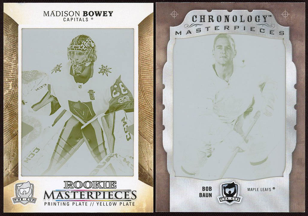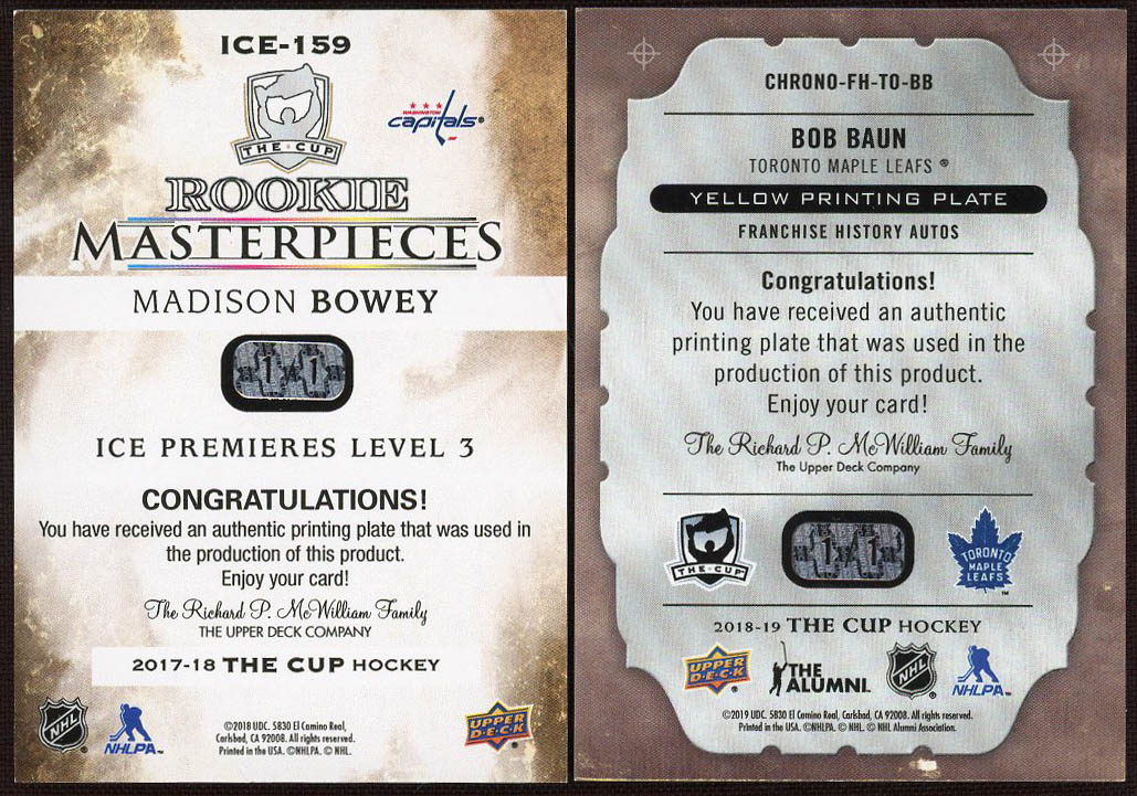 Lot of (2) Upper Deck Hockey Cards with Madison Bowey 2017-18 The Cup Printing Plates Upper Deck Ice Yellow #159 & Bob Baun 2018-19 The Cup Printing Plates Chronology Franchise History Yellow #FHTOBB