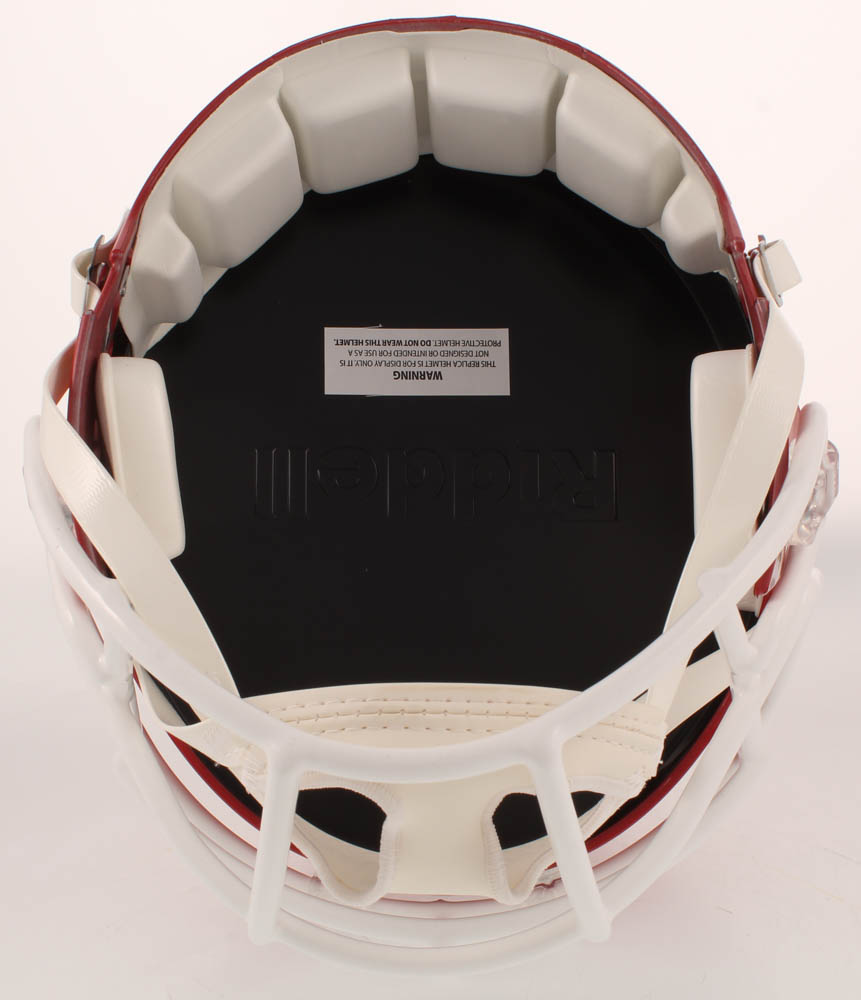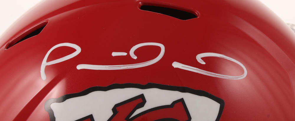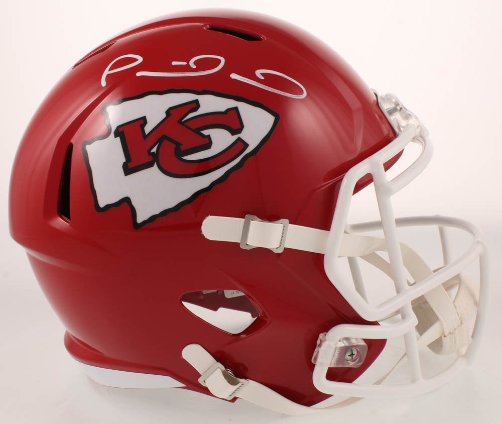 Riddell Kansas City Chiefs full-size replica speed helmet. Hand-signed in white paint pen by Patrick Mahomes.