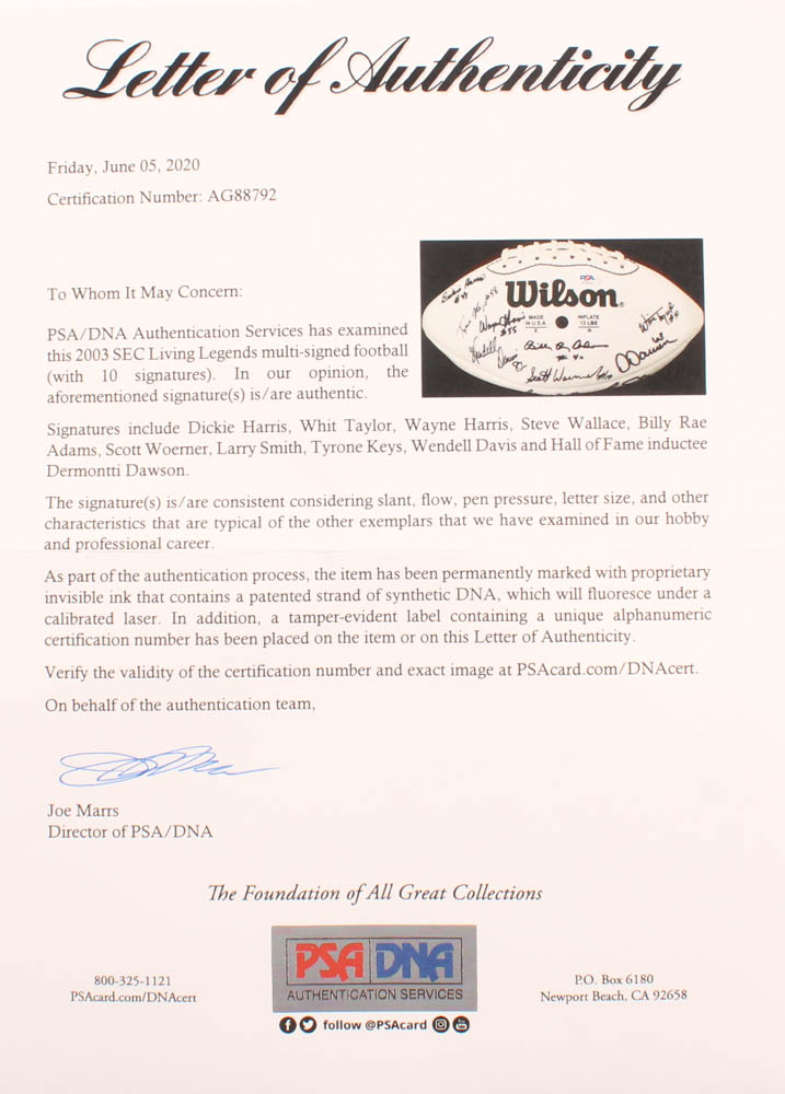 Living Legends 2003 SEC Championship Logo Football has been hand signed in black felt tip pen By (10) With Dickie Harris, White Taylor, Wayne Harris, Steve Wallace, Billy Rae Adams, Scott Woerner, Larry Smith, Tyrone Keys, Wendell Davis and Dermontti Dawson.