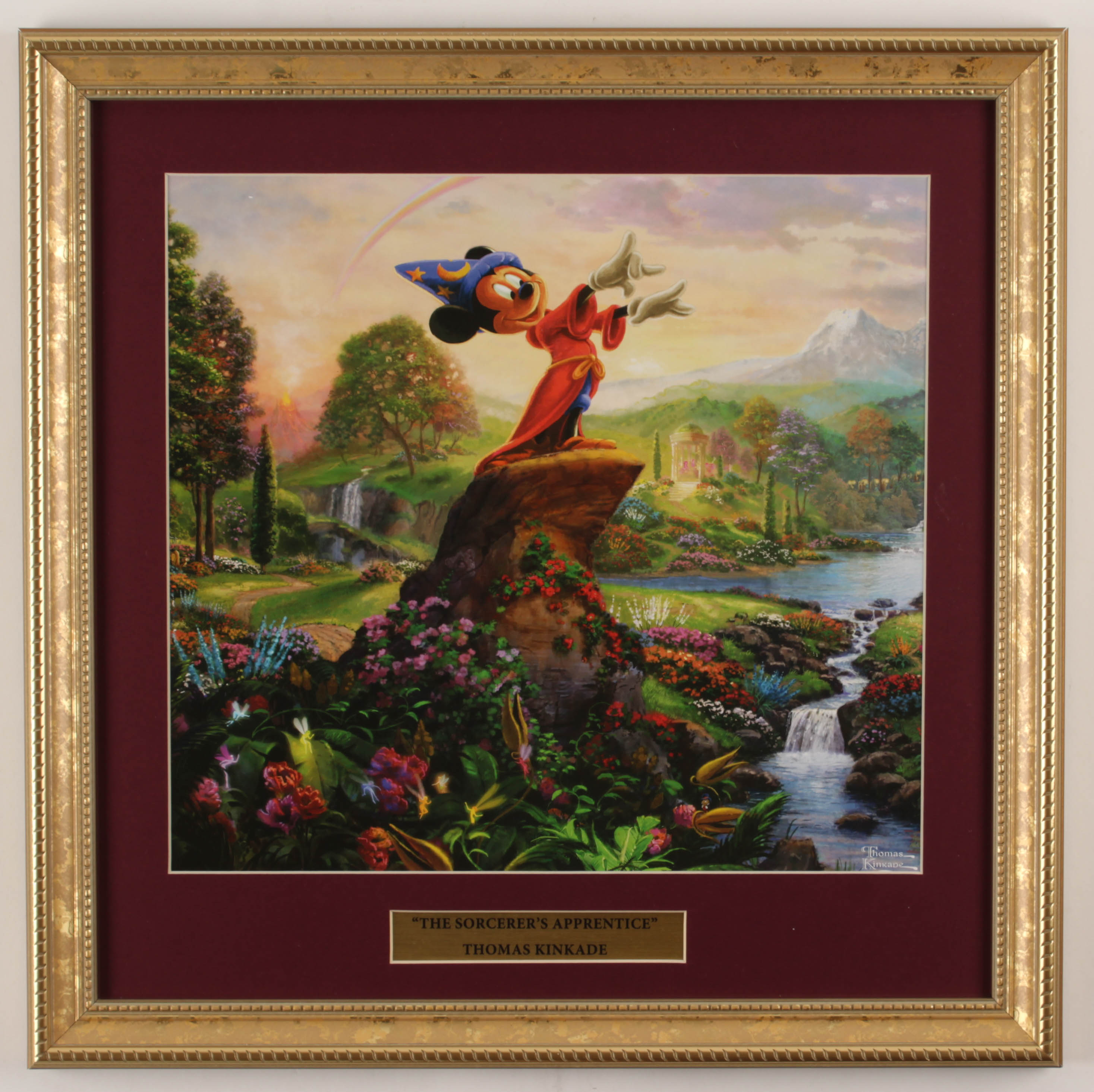 Custom frame measures 16" x 16" in size and features a print of "The Sorcerer's Apprentice" by Thomas Kinkade (D. 2012).