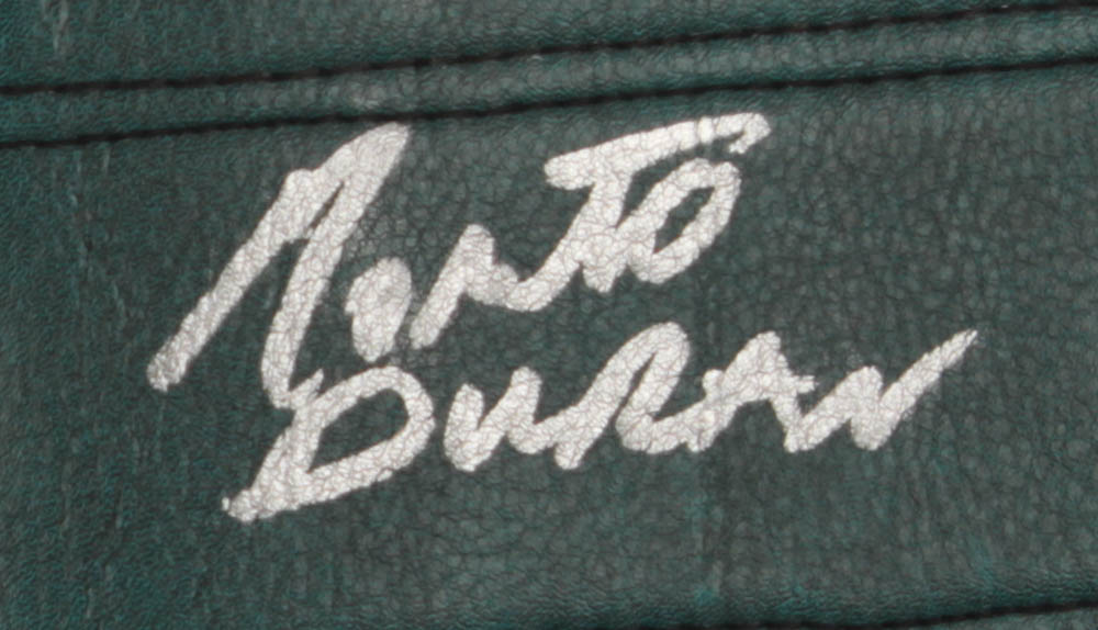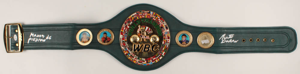 World Boxing Association replica belt has been hand-signed and inscribed in silver paint pen by Roberto Duran.