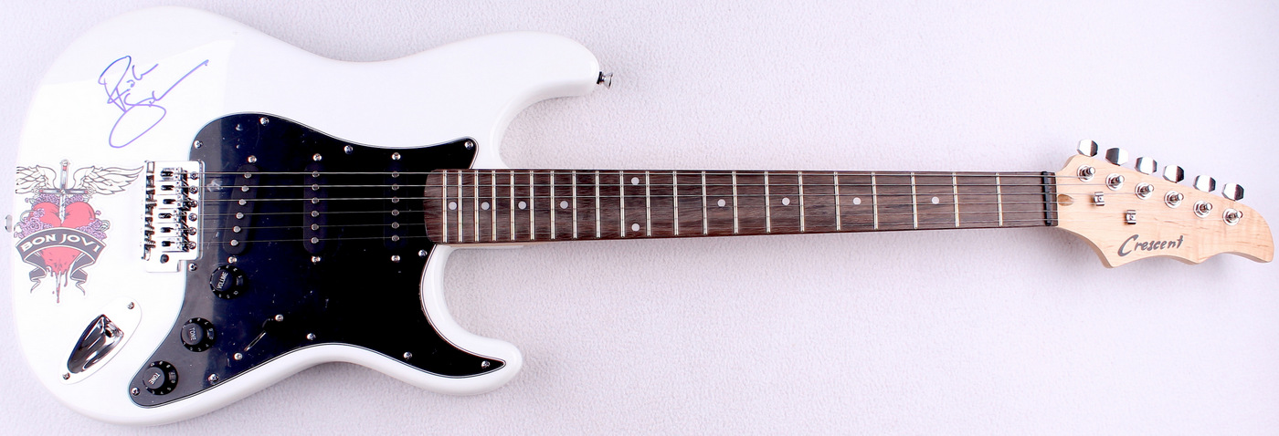 Crescent full-size electric guitar signed on the body in blue felt-tip pen by Richie Sambora. The guitar includes a Boni Jovi decal. Please note that the guitar has some minor scratches, see photos for details.