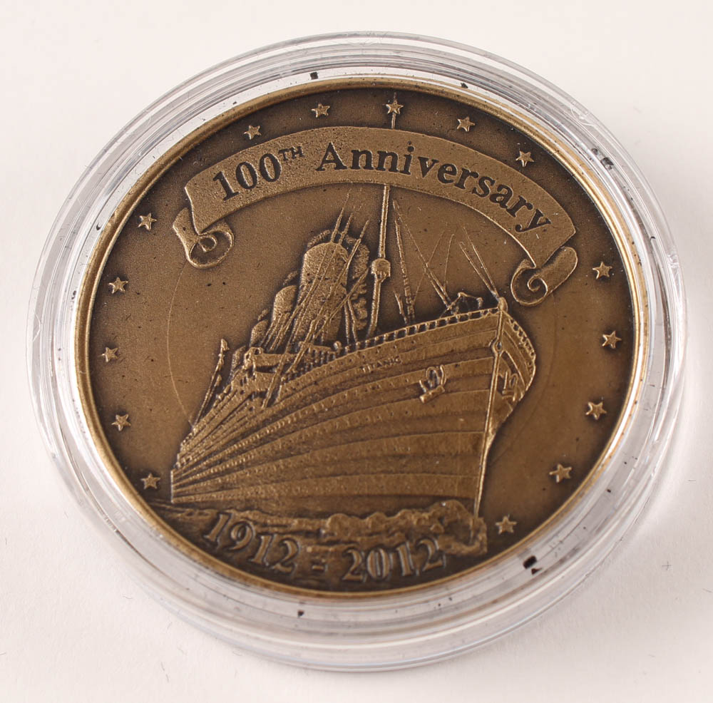 2012 Bronze-finished coin commemorating the 100th year anniversary of the Titanic's sole voyage. Coin features authentic coal recovered from the wreckage of the ship recovered during the 2000 Titanic Research and Recovery Expedition. Coin is limited edition and has been numbered #12,113/25,000. Please see images for details regarding the condition of the coin.