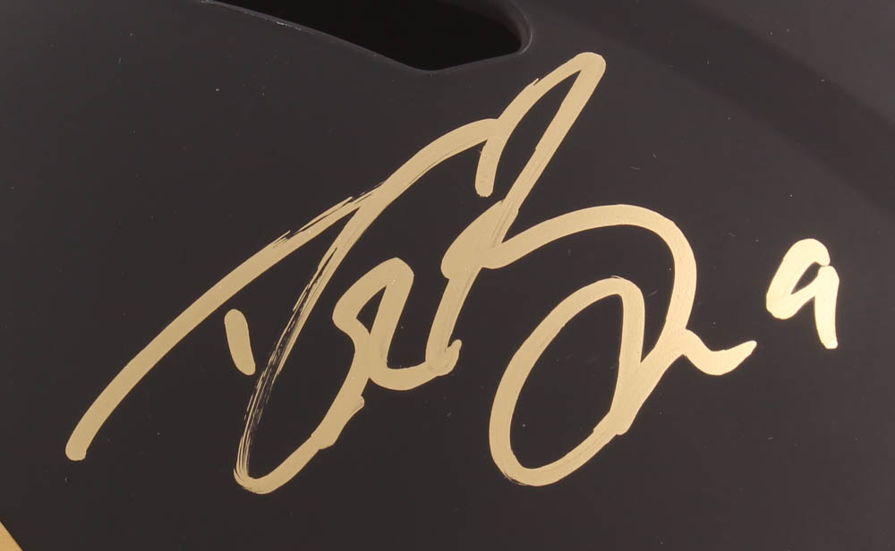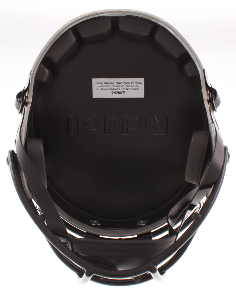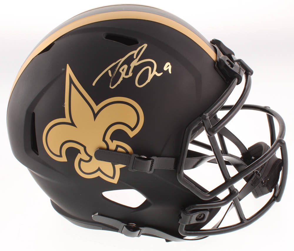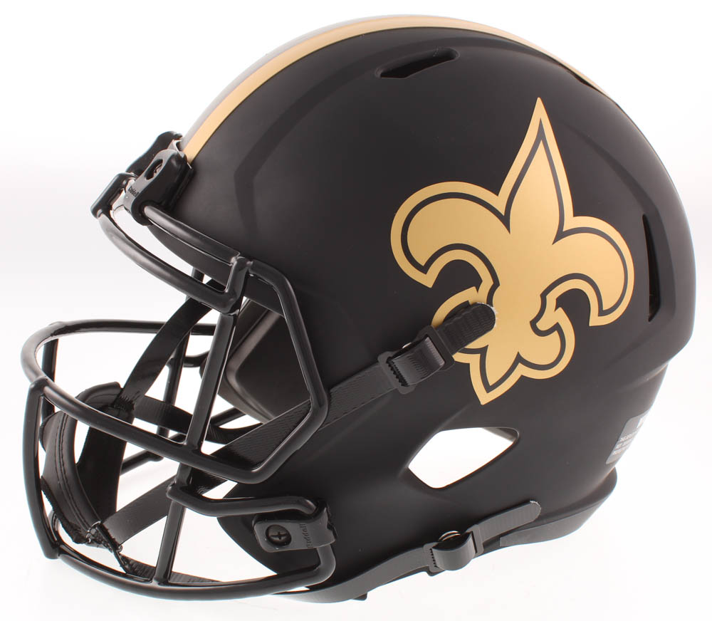 New Orleans Saints Eclipse Alternate replica full-size speed helmet has been hand-signed in gold paint pen by Drew Brees.