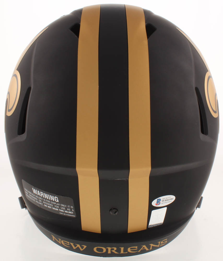 New Orleans Saints Eclipse Alternate replica full-size speed helmet has been hand-signed and inscribed in gold paint pen by Drew Brees.