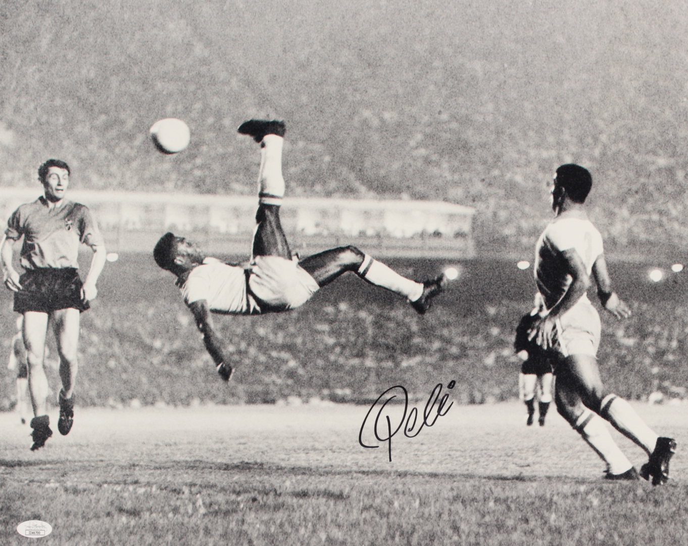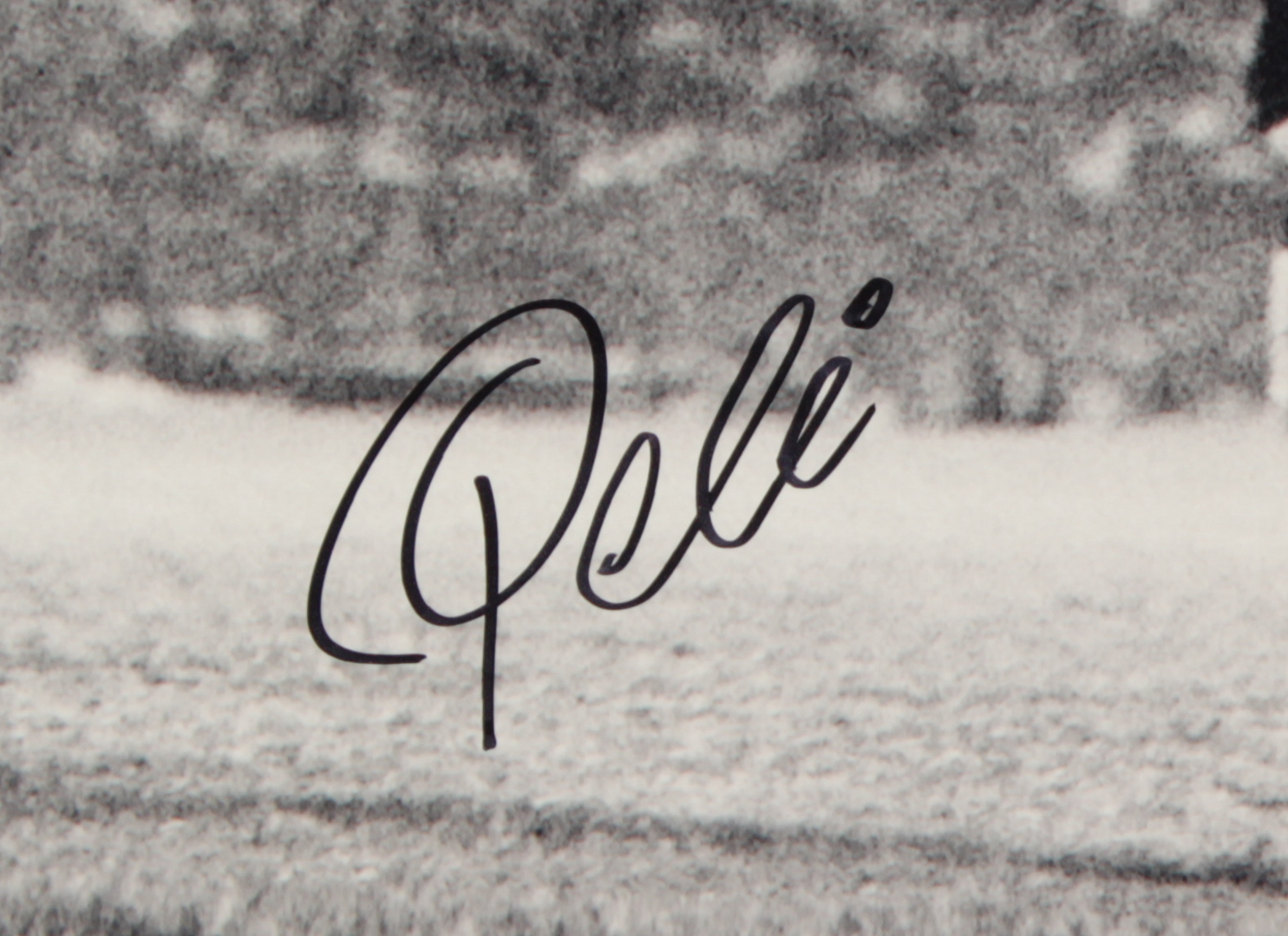 Photo measures 16" x 20" in size and has been hand-signed in black felt-tip pen by Pele.
