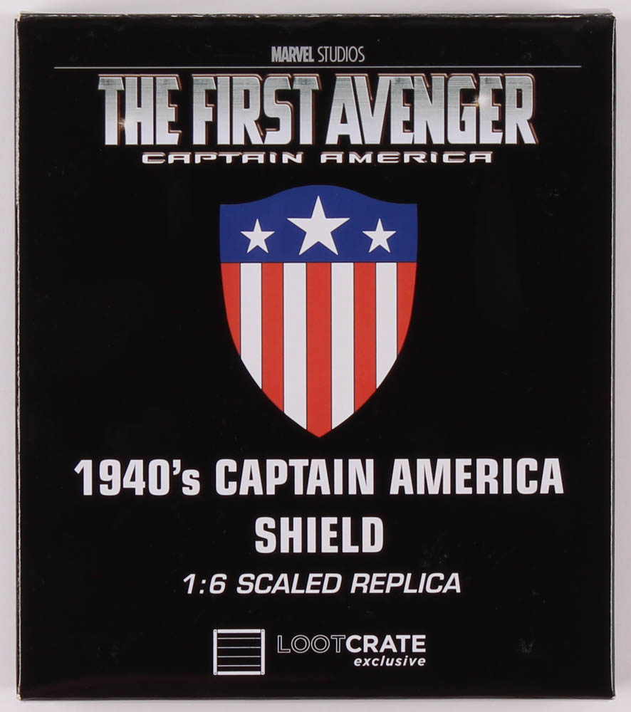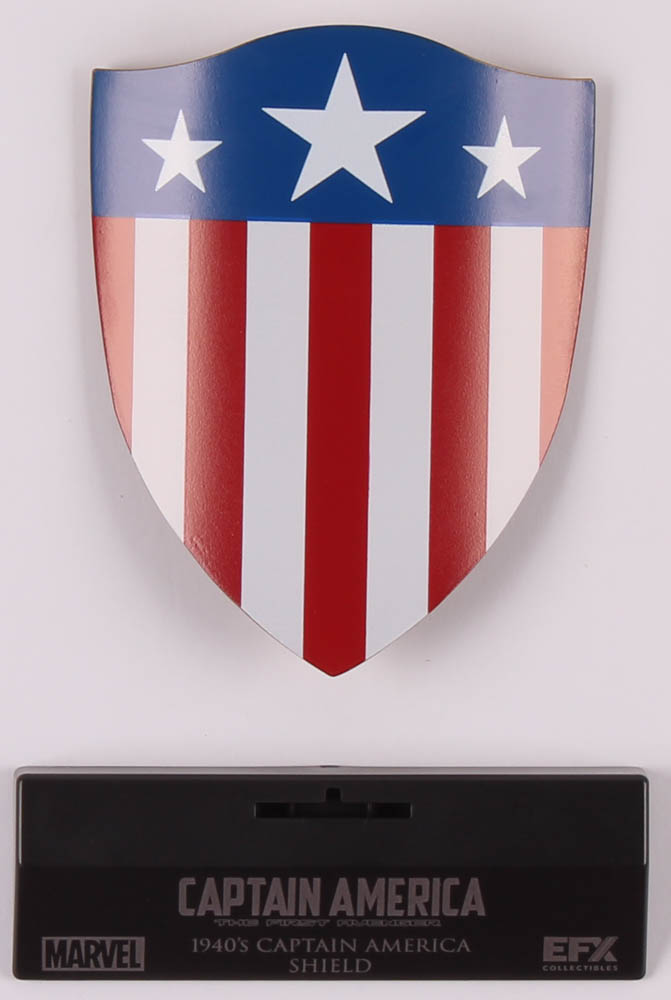 EFX miniature 1:6 scale "Captain America: The First Avenger" 1940's shield prop replica. Measures approximately 5.5" tall with the stand. Created using the original digital files and reference materials from Marvel Studios. Also includes the original packaging. Please note, the item is unsigned.