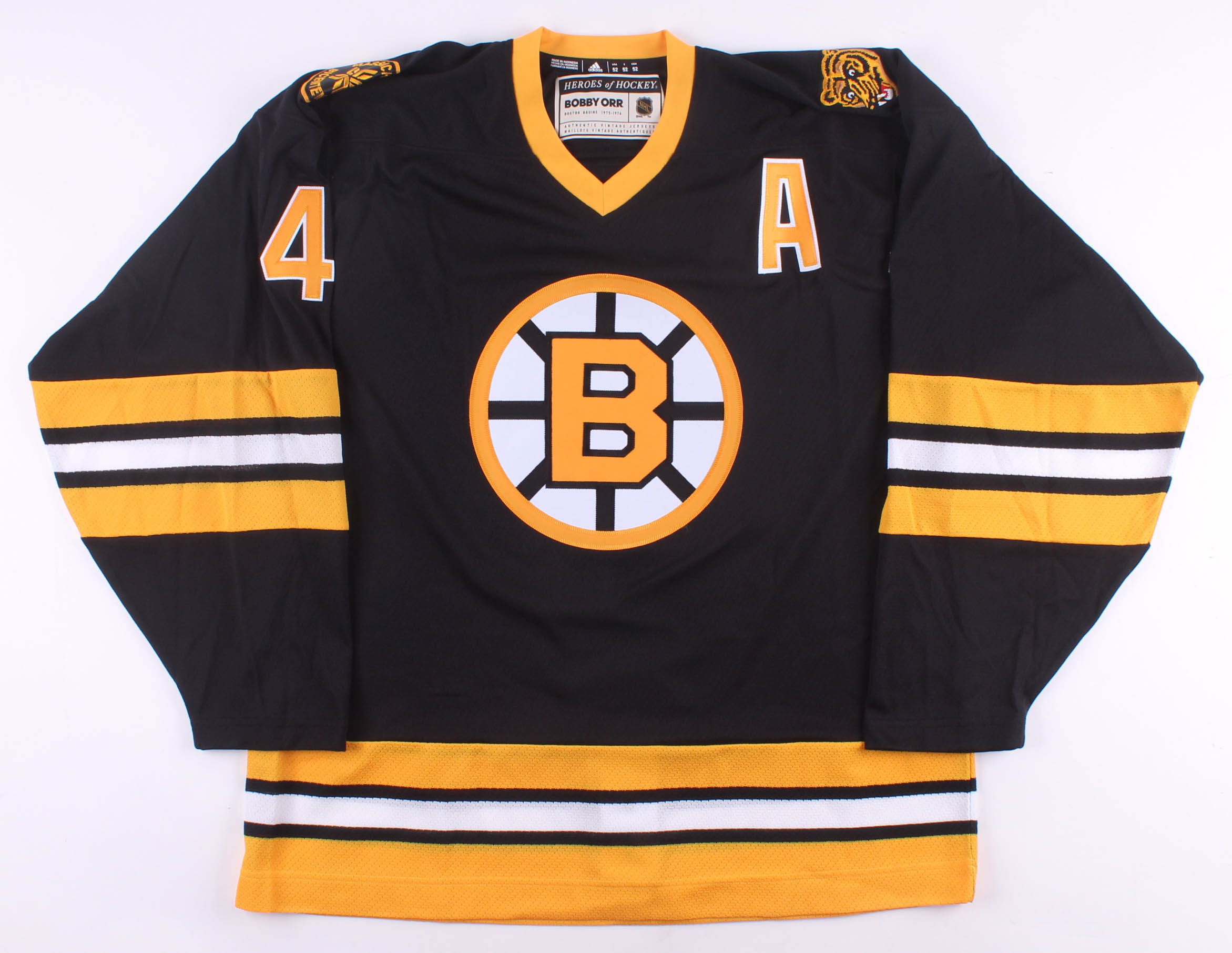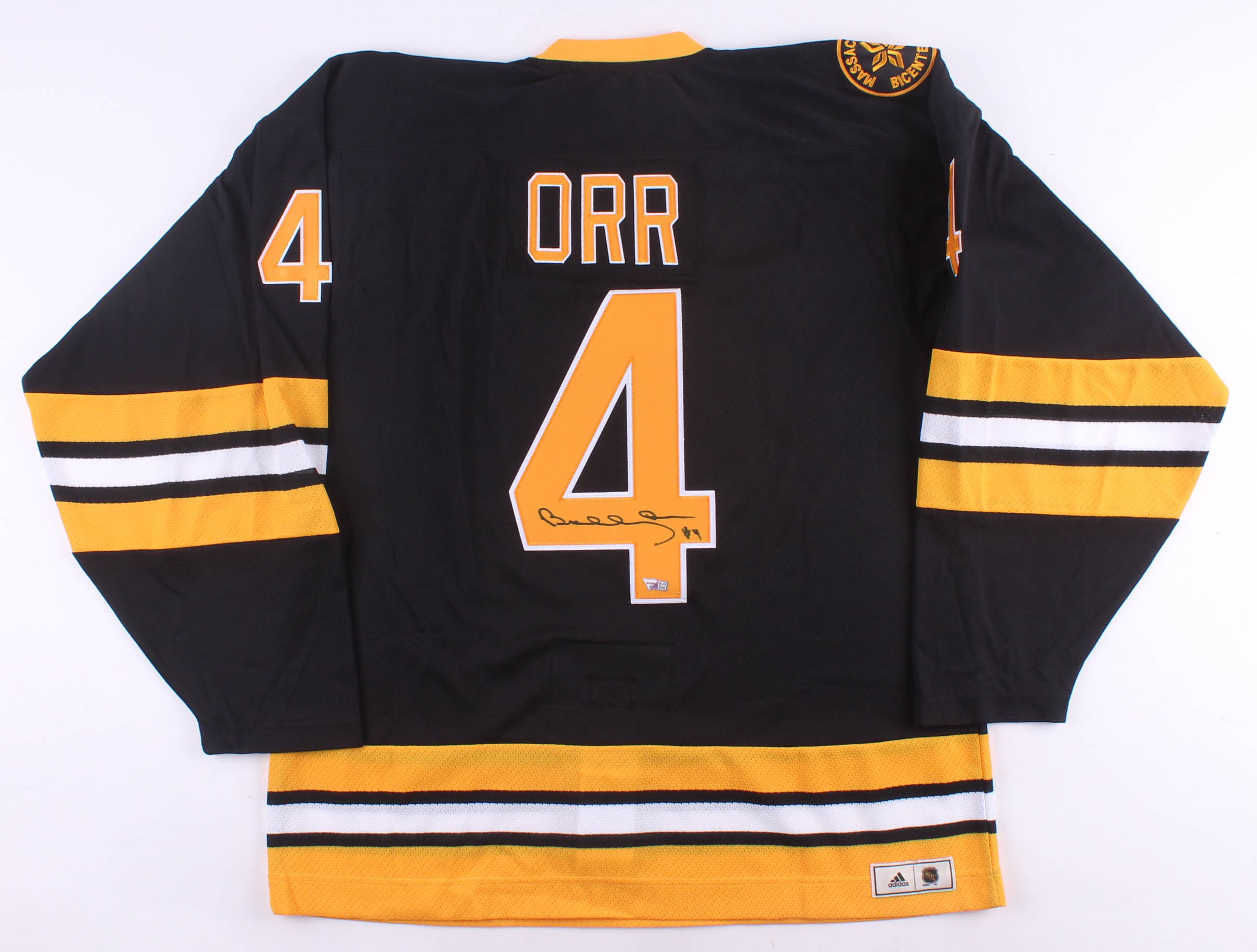 Adidas on-ice style jersey. Everything is sewn on, size XL. Hand-signed in black felt-tip pen by Bobby Orr (Boston Bruins, HOF).