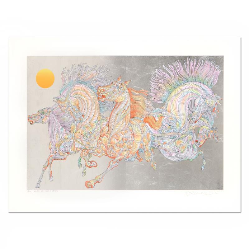 "Lever De Soleil" is a limited edition serigraph on paper with hand laid silver leaf by Guillaume Azoulay, numbered and hand signed by the artist. Includes Letter of Authenticity. Measures approx. 38" x 27.5" (border), 32" x 21" (image).