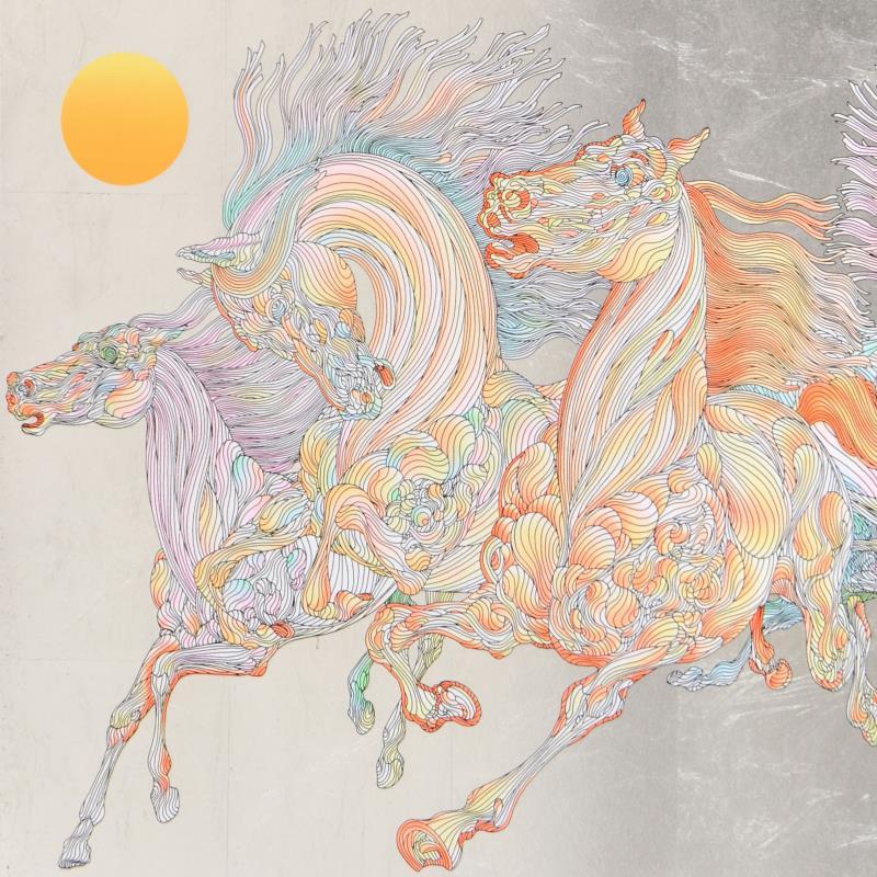Horses, dancers and figures are treated as graphic landscapes. Hooves, heads, manes and limbs are so many hills and valleys. Shaded glades are evoked by the manipulation of parallel lines theatrically meandering, running close at times then separating to mimic the topography of some lost geography. His colors are the rainbow-like refraction of light after a downpour as they pick up the threads of his linear tale and weave them into a solid cloth.