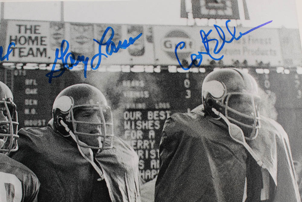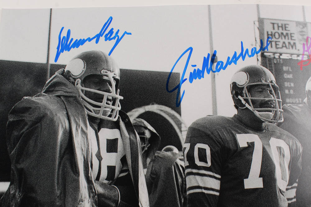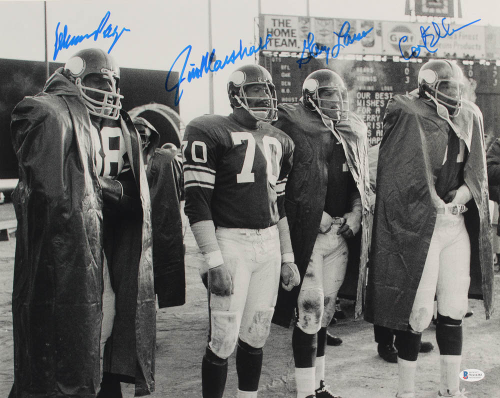 Photo measures 16" x 20" in size and has been hand-signed in blue felt-tip pen by Carl Eller (HOF), Jim Marshall, Alan Page (HOF), and Gary Larsen. (Minnesota Vikings)