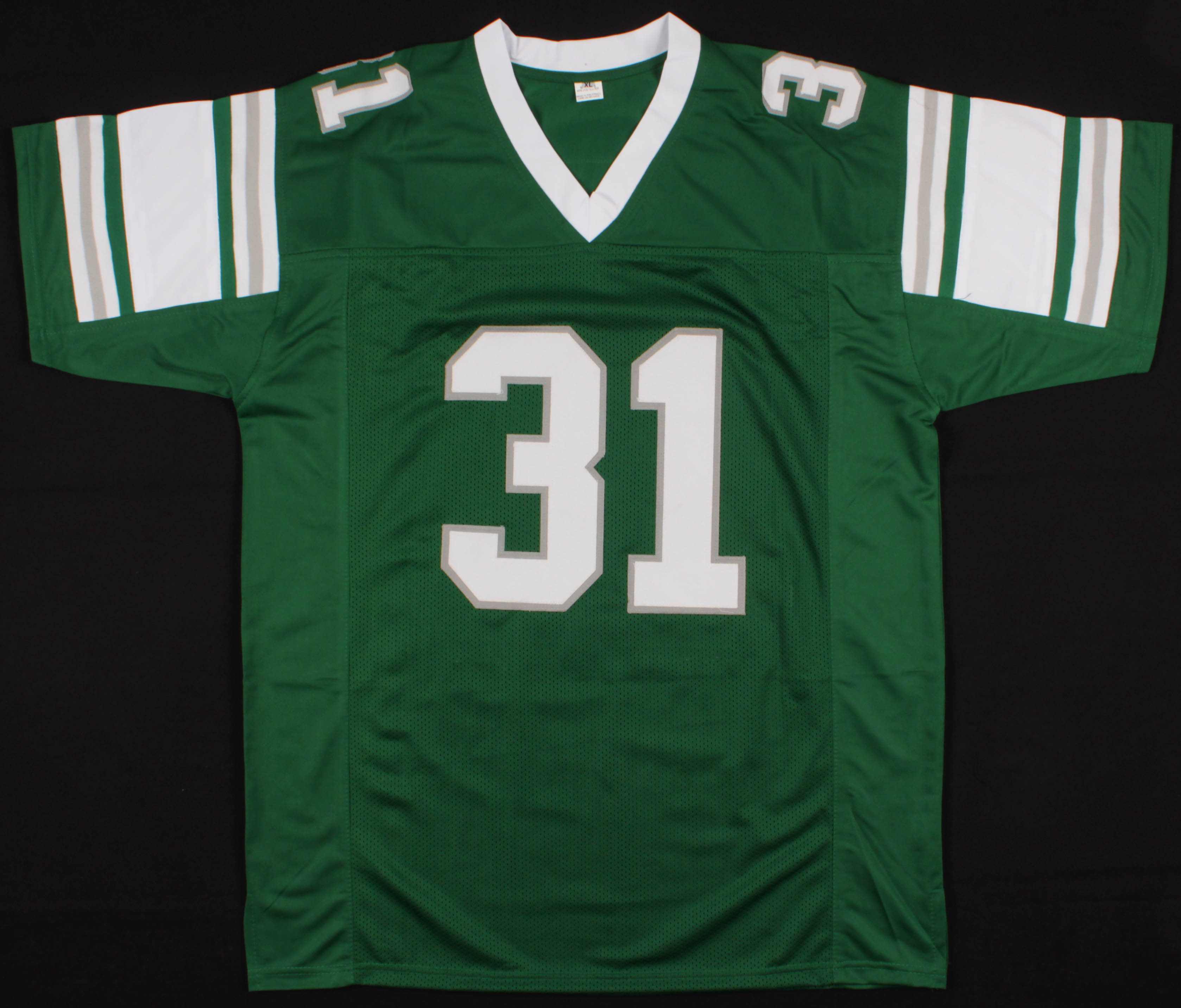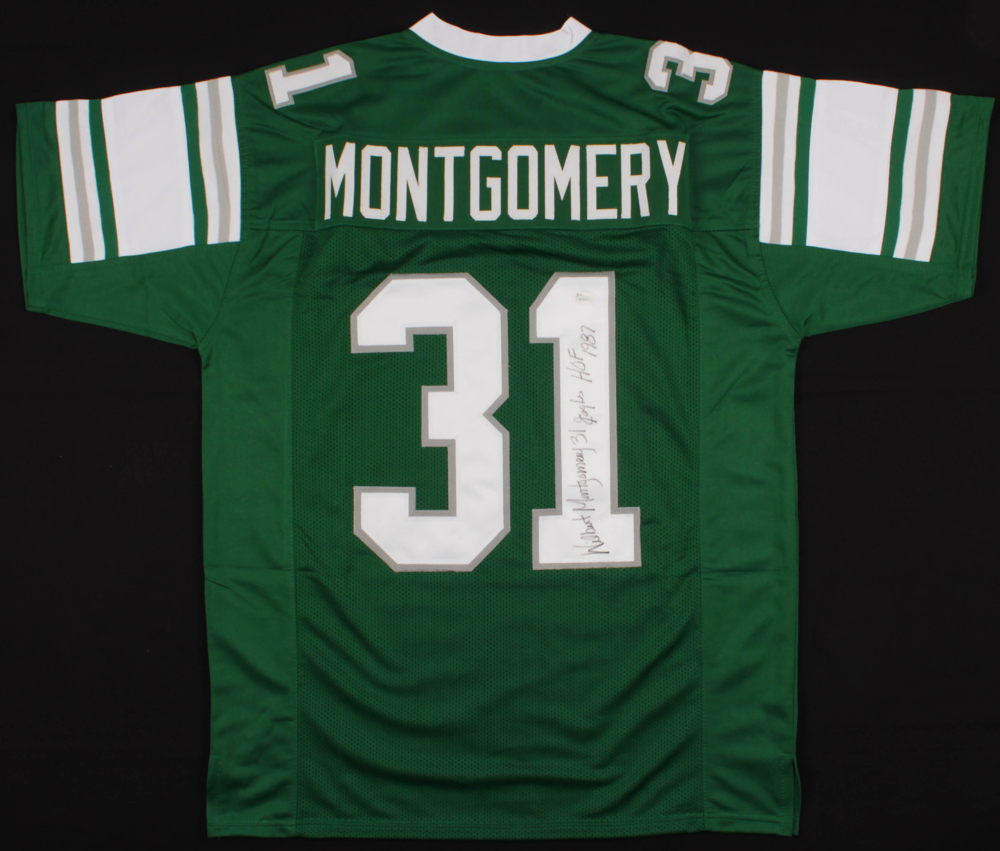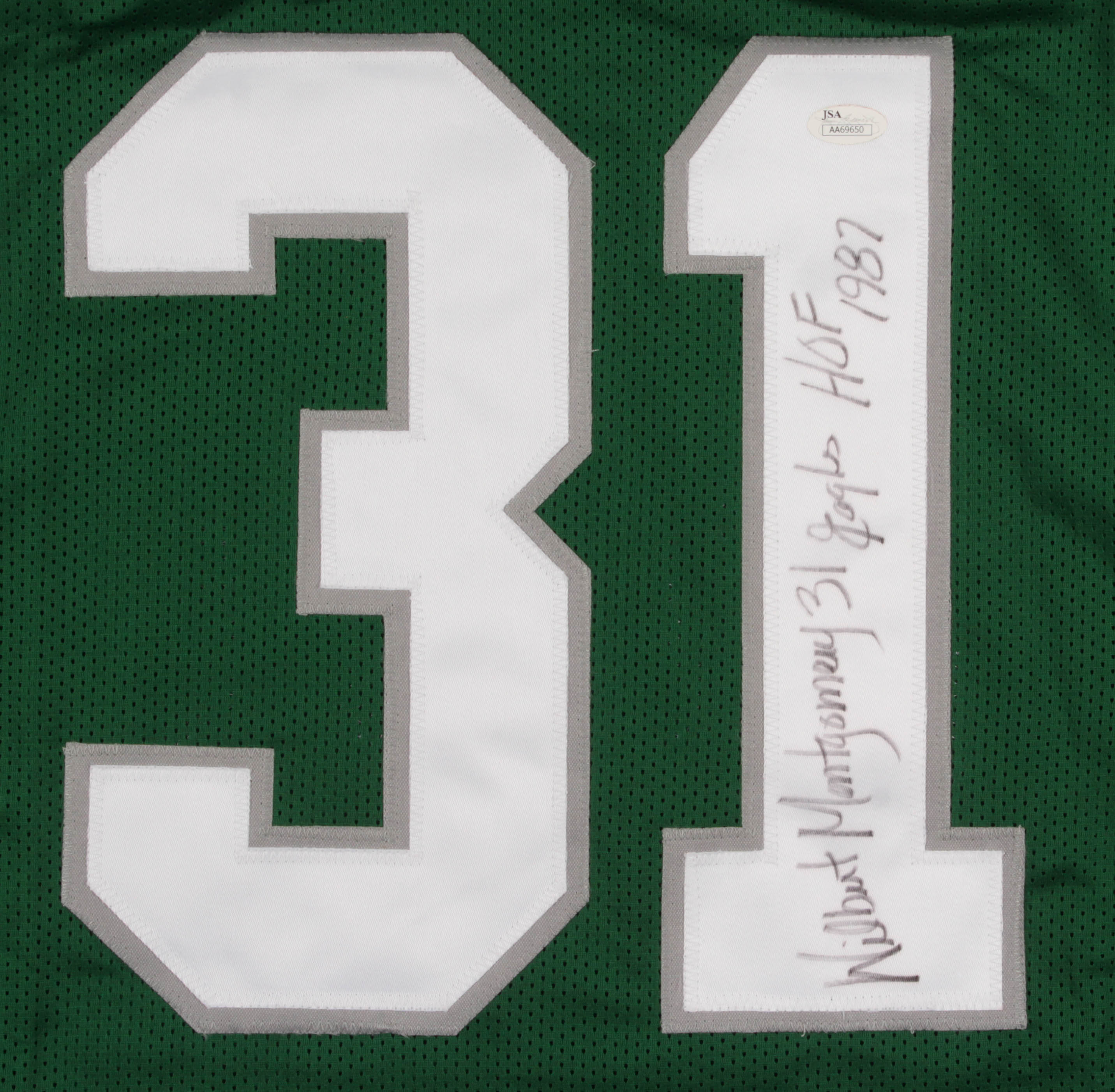 Custom on-field style jersey. Everything is sewn on, size XL. Hand-signed and inscribed in black felt-tip pen by Wilbert Montgomery.