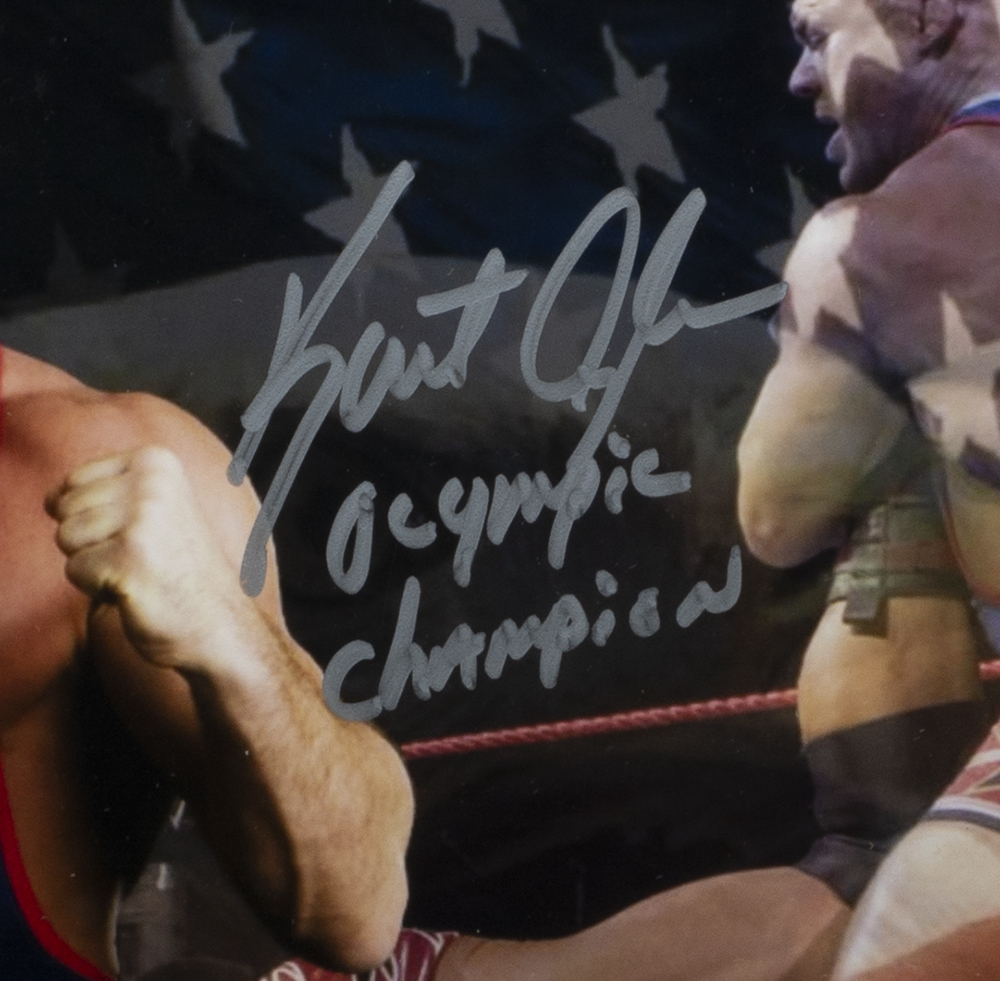 Custom frame measures approximately 11" x 14" in size and has been hand-signed in silver paint pen by Kurt Angle (HOF).