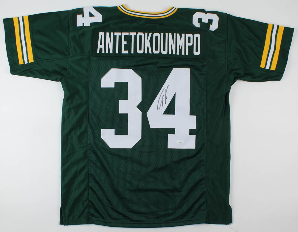 Custom on-field style jersey. Everything sewn on, size XL. Hand-signed in black felt tip pen by Giannis Antetokounmpo.