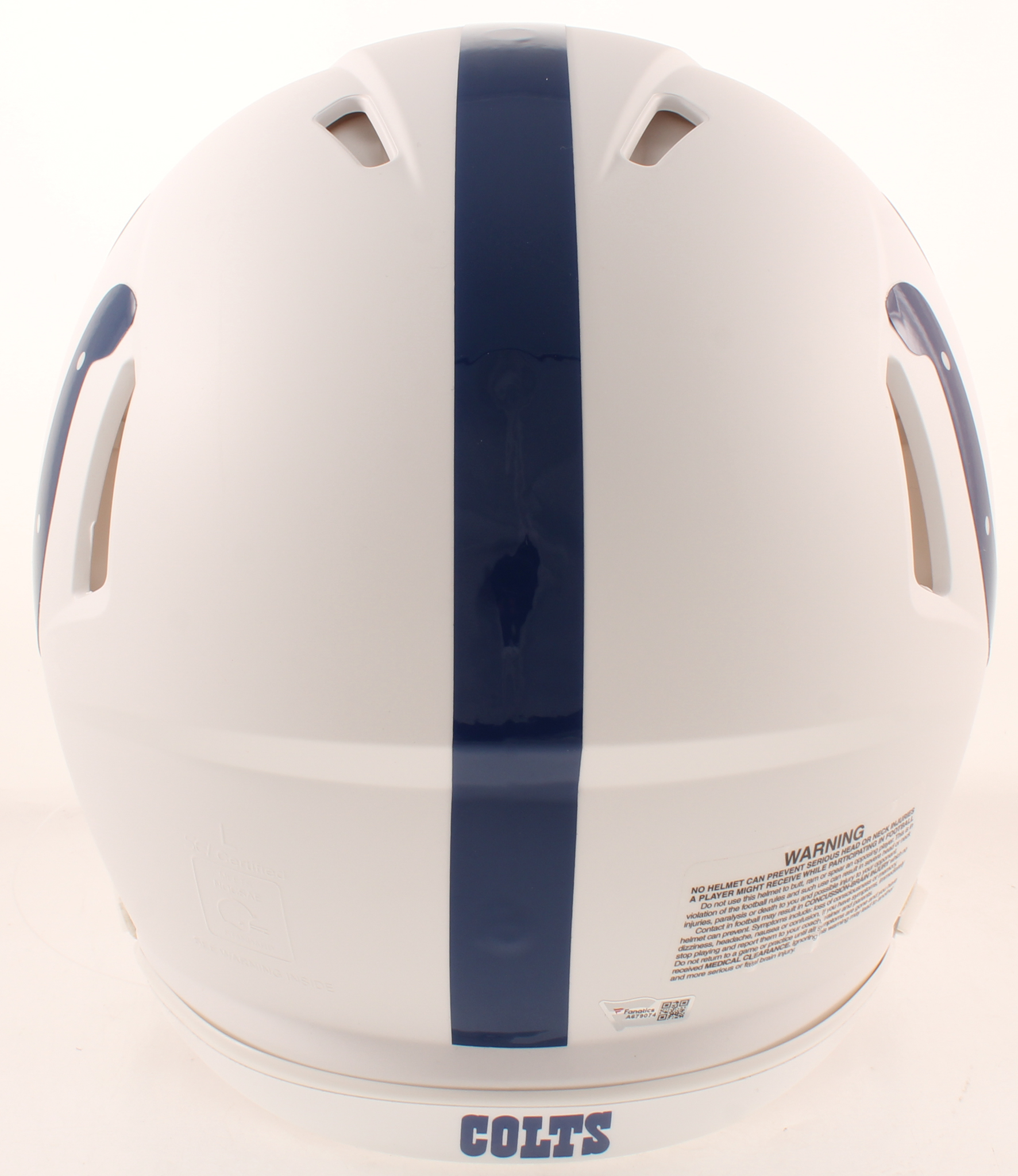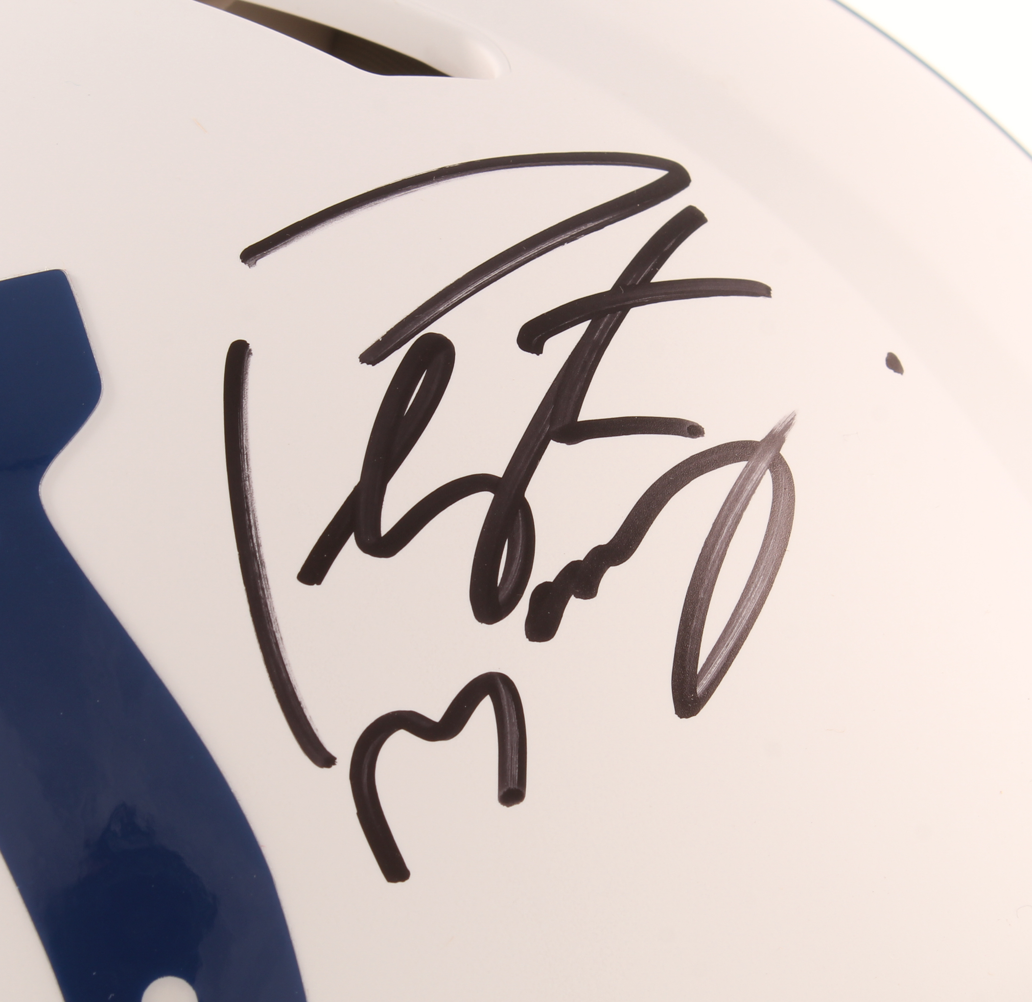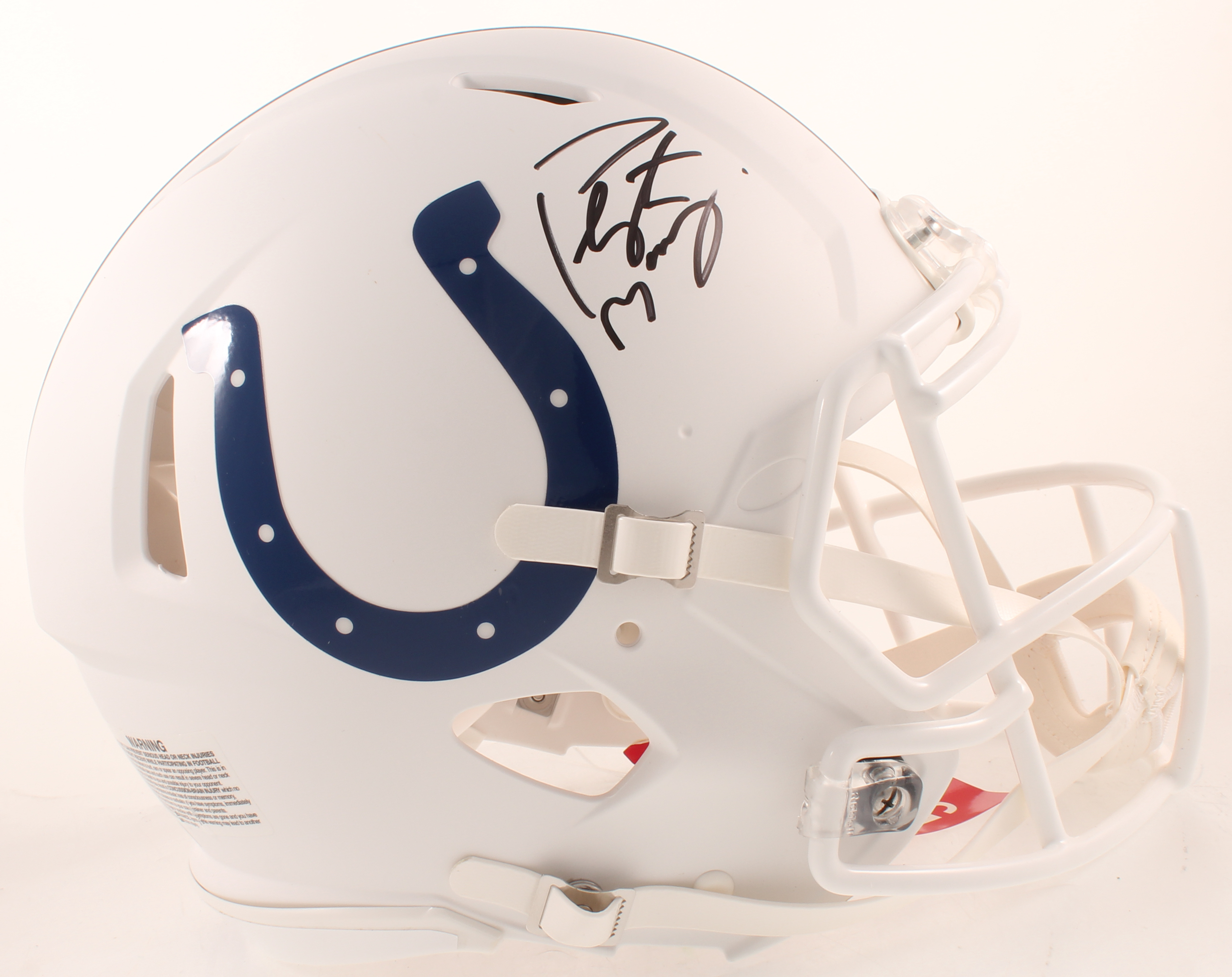 Riddell Indianapolis Colts full-size authentic on-field speed helmet. Hand-signed in black felt-tip pen by Peyton Manning.
