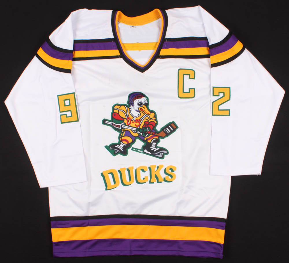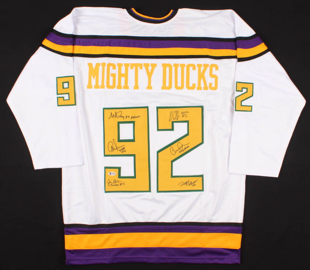 Custom on-ice style jersey. Everything is sewn on, size XL. Has been hand-signed and inscribed in black felt-tip pen by (6) including Matt Doherty (Lester Averman), Jane Plank (Tammy Duncan), Vincent LaRusso (Adam Banks), Danny Tamberelli (Tommy Duncan), Aaron Schwartz (Dave Karp), and Garette Ratliff Henson (Guy Germaine). Please see photos for more details regarding the condition of the jersey.