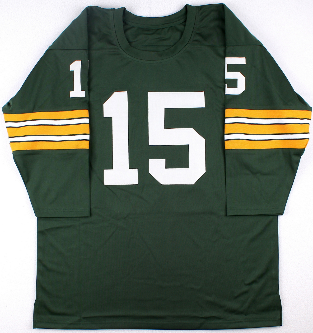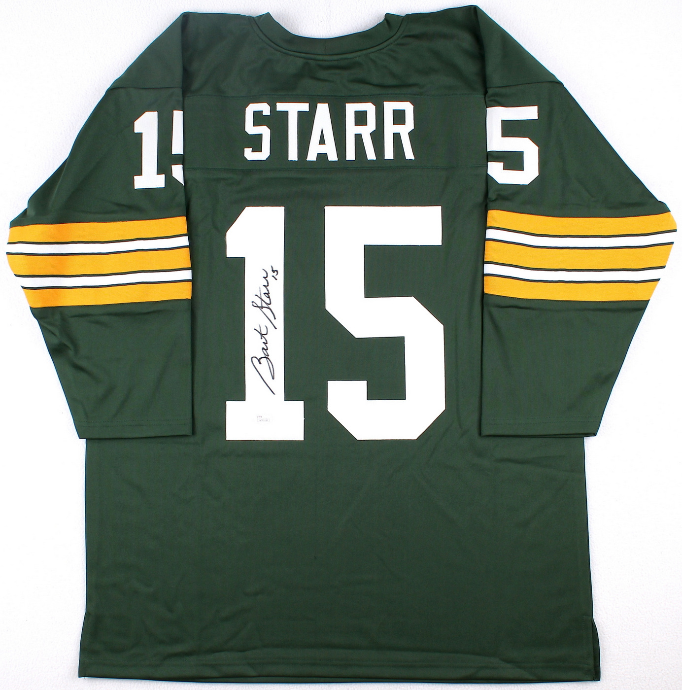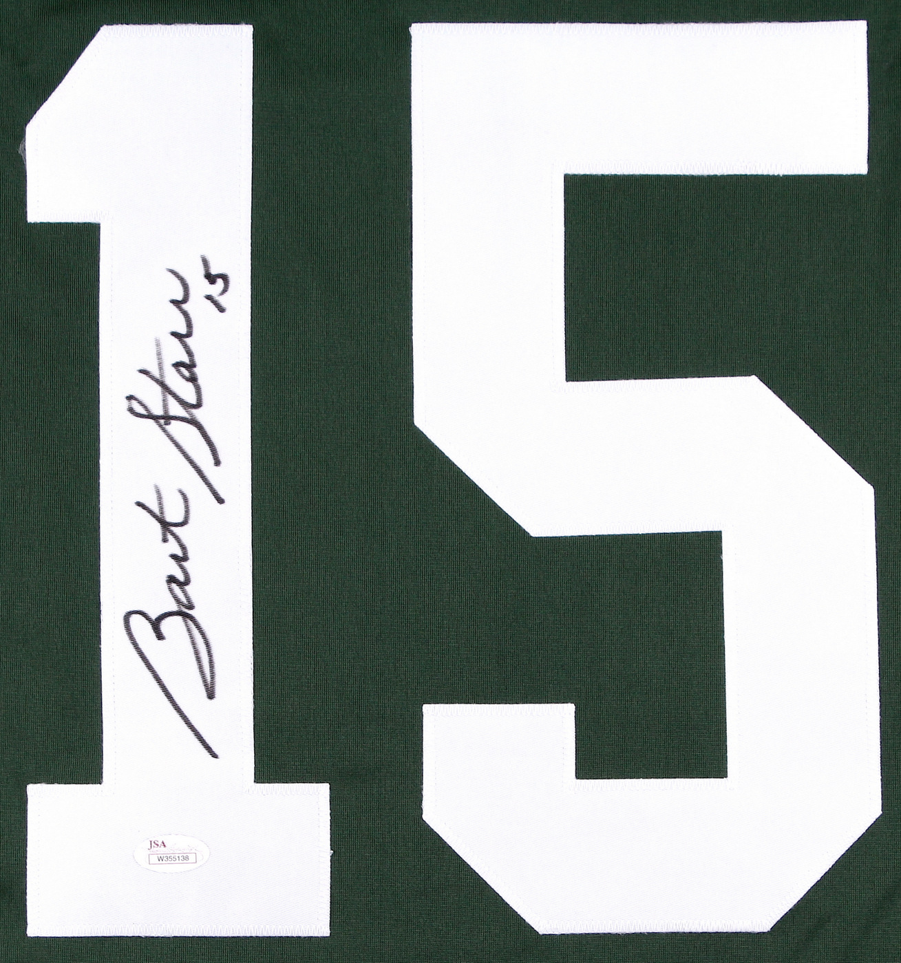 Custom on-field style jersey. Everything is sewn on, size XL. Hand-signed in black felt tip pen by Bart Starr (HOF). The autograph includes an official James Spence Authentication (JSA) hologram and matching COA for authenticity purposes. The signing of this item was witnessed by JSA.