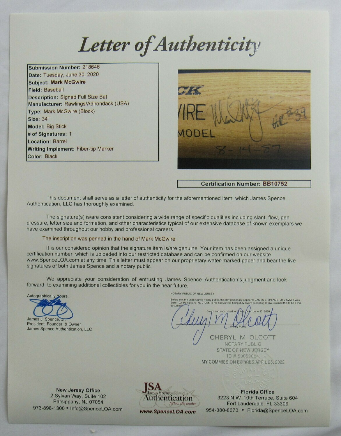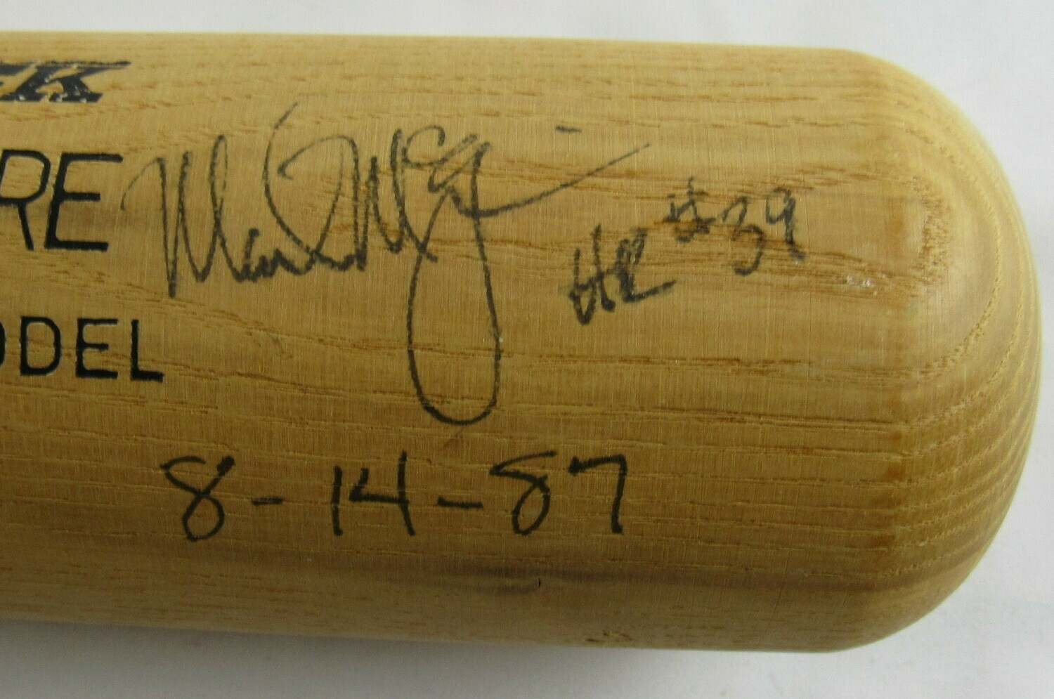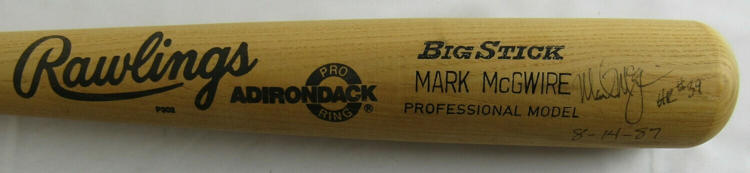 Mark McGwire Signed Rawlings Player Model Baseball Bat Inscribed "HR #39 8-14-87" (JSA LOA)