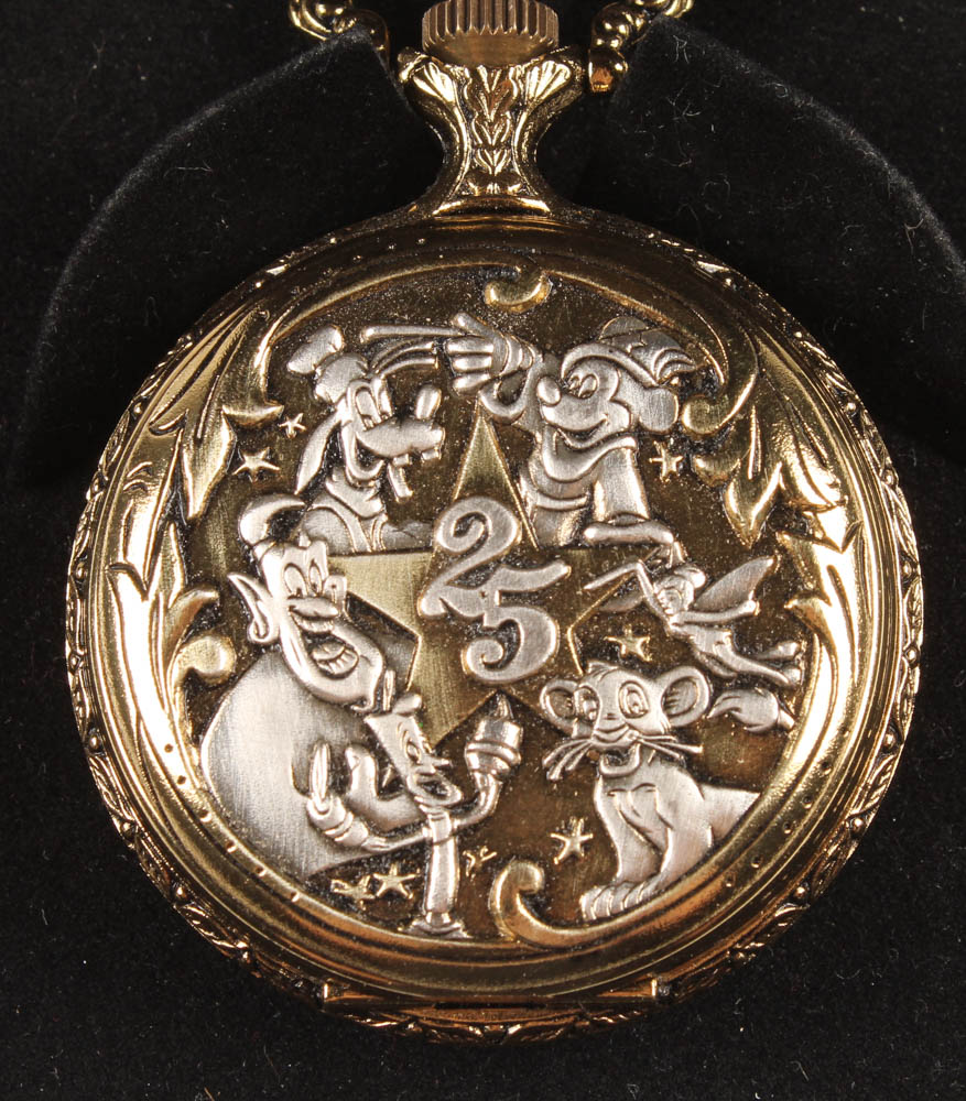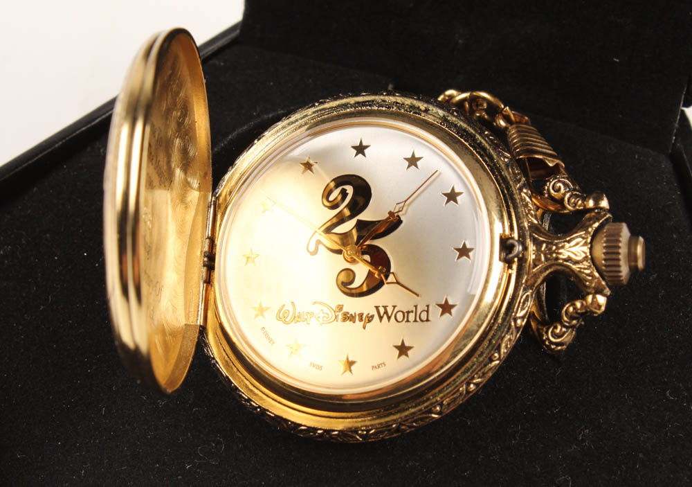 Walt Disney World 25th Anniversary Pocket Watch. Includes the case shown. Please see photos for details regarding condition.