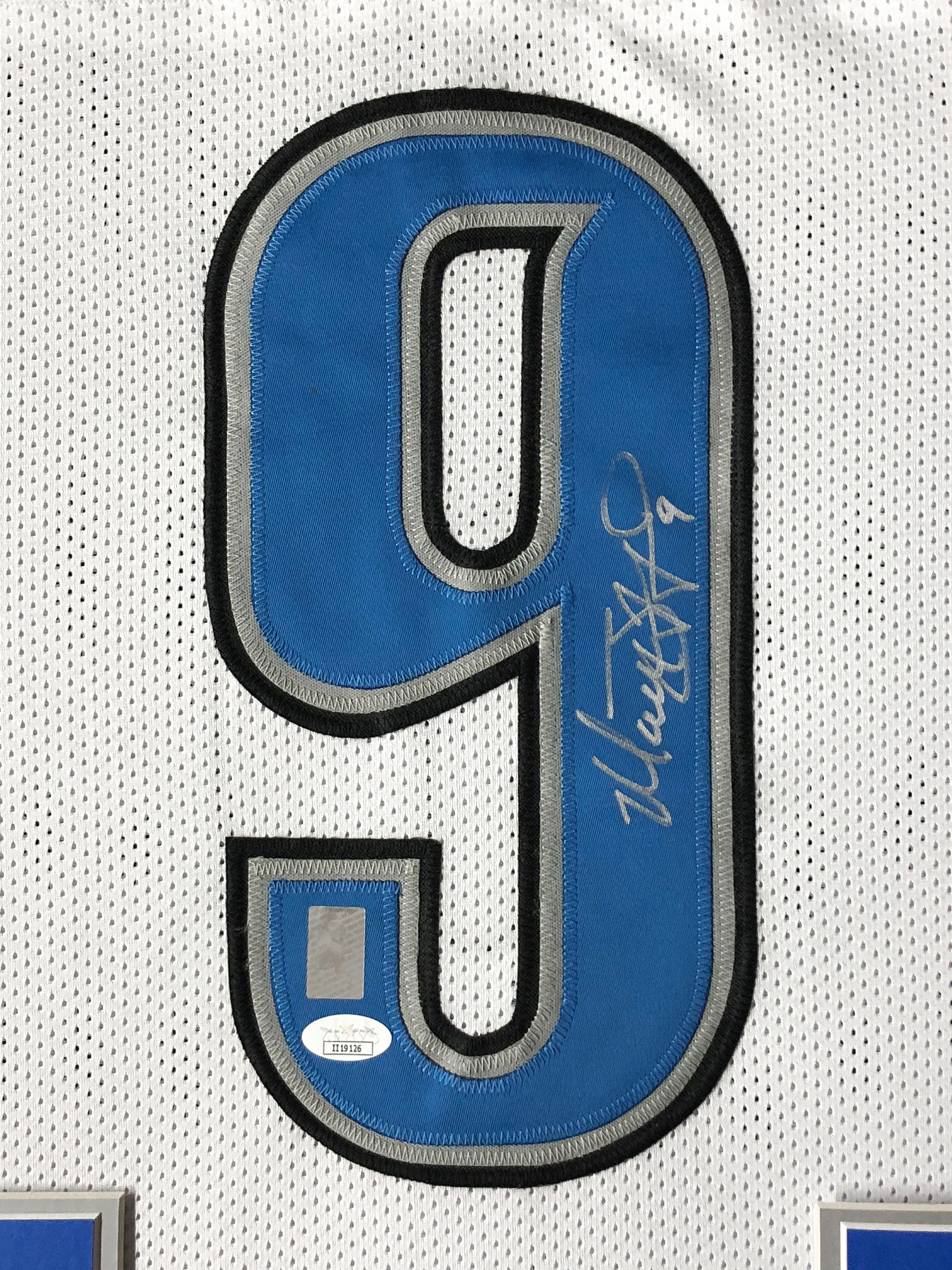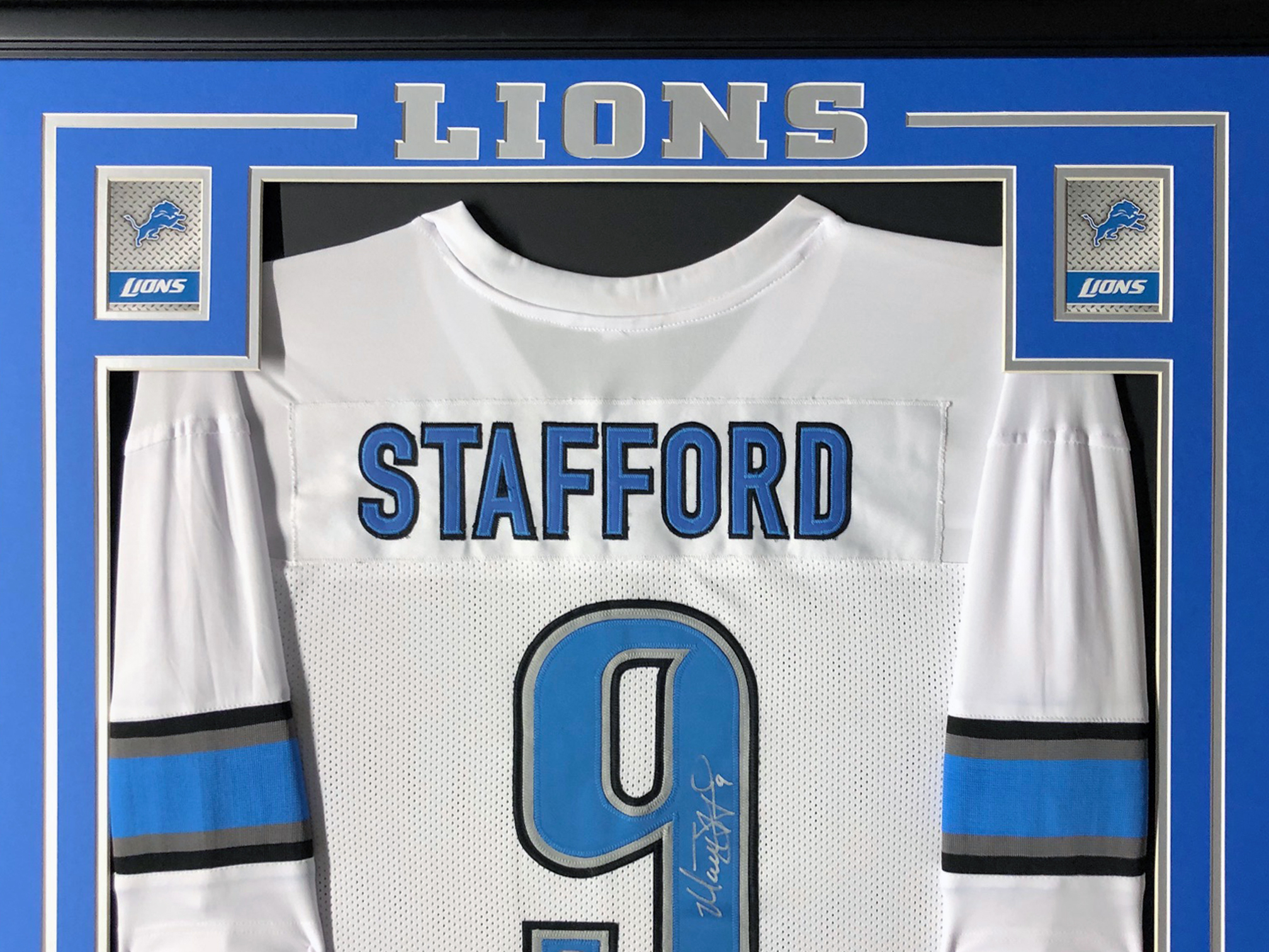 Custom frame measures approximately 34.5" x 42.5" in size and showcases a jersey which has been hand-signed in silver paint pen by Matthew Stafford (Detroit Lions). High quality framing includes the following unique features: Jersey is hand-sewn to the back mat board, real wood molding, ultra strong and crystal clear UV-resistant acrylic, (2) licensed logo cards, (2) 8x10 photos, and a double-layer laser-engraved metal nameplate.