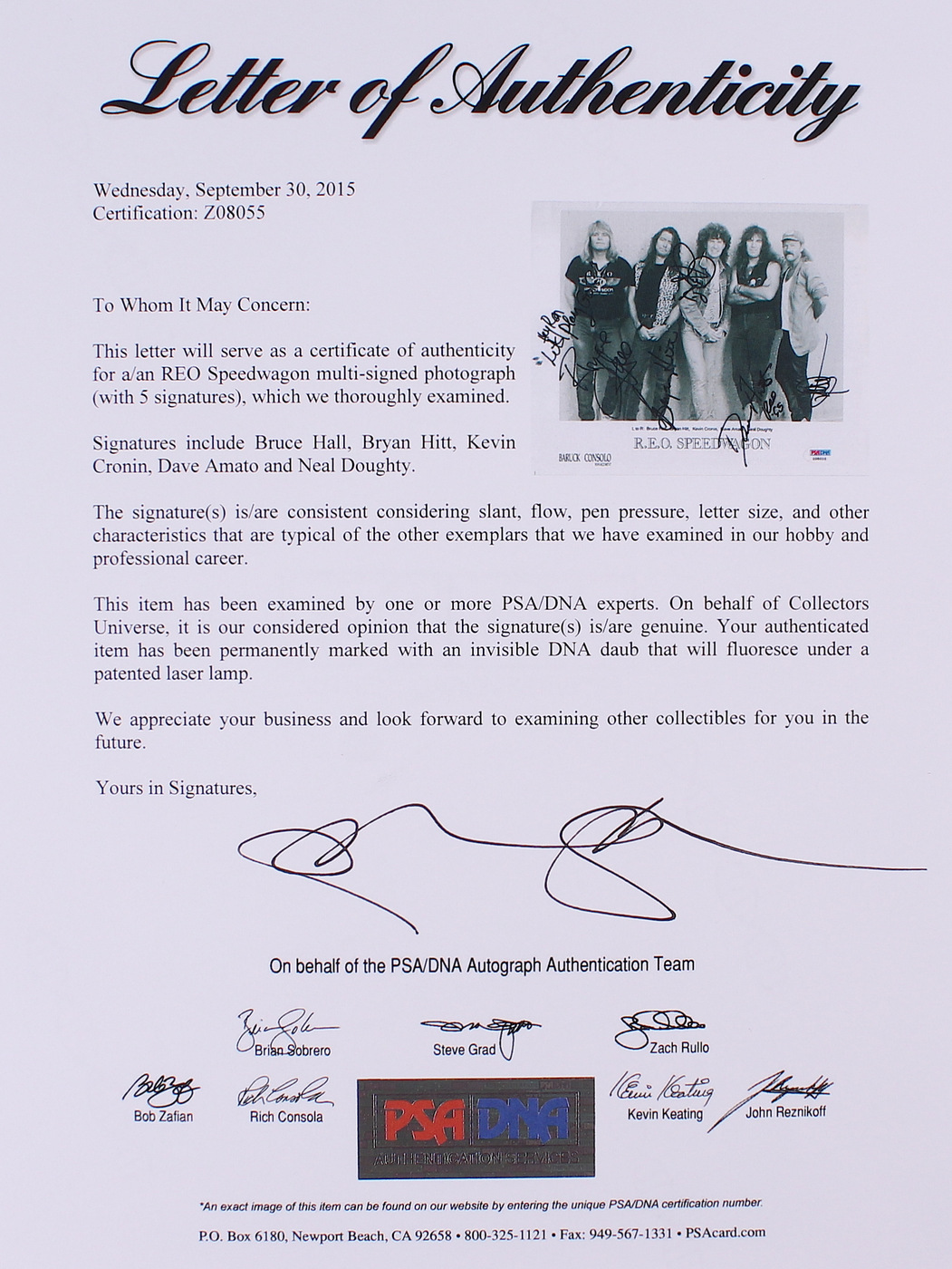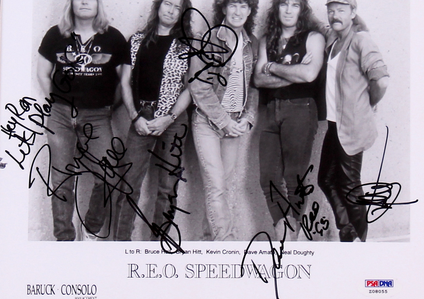 Custom framed photo display measures 15" x 17" in size. Features a photo that has been hand-signed in black felt-tip pen by Bruce Hall, Bryan Hitt, Kevin Cronin, Dave Amato & Neal Doughty. The autograph includes an official PSA/DNA hologram and matching LOA for authenticity purposes.