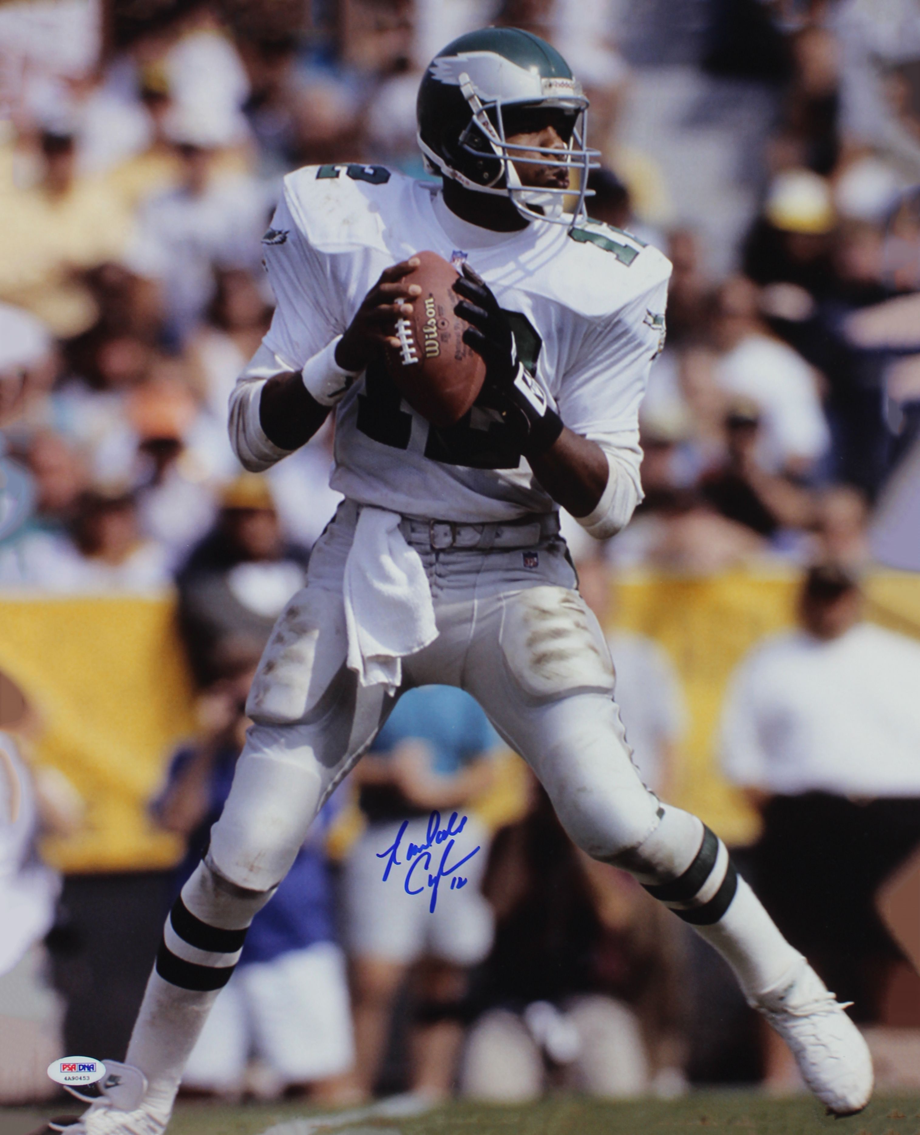 Photo measures 16" x 20" in size and has been hand-signed in blue felt-tip pen by Randall Cunningham (Philadelphia Eagles).
