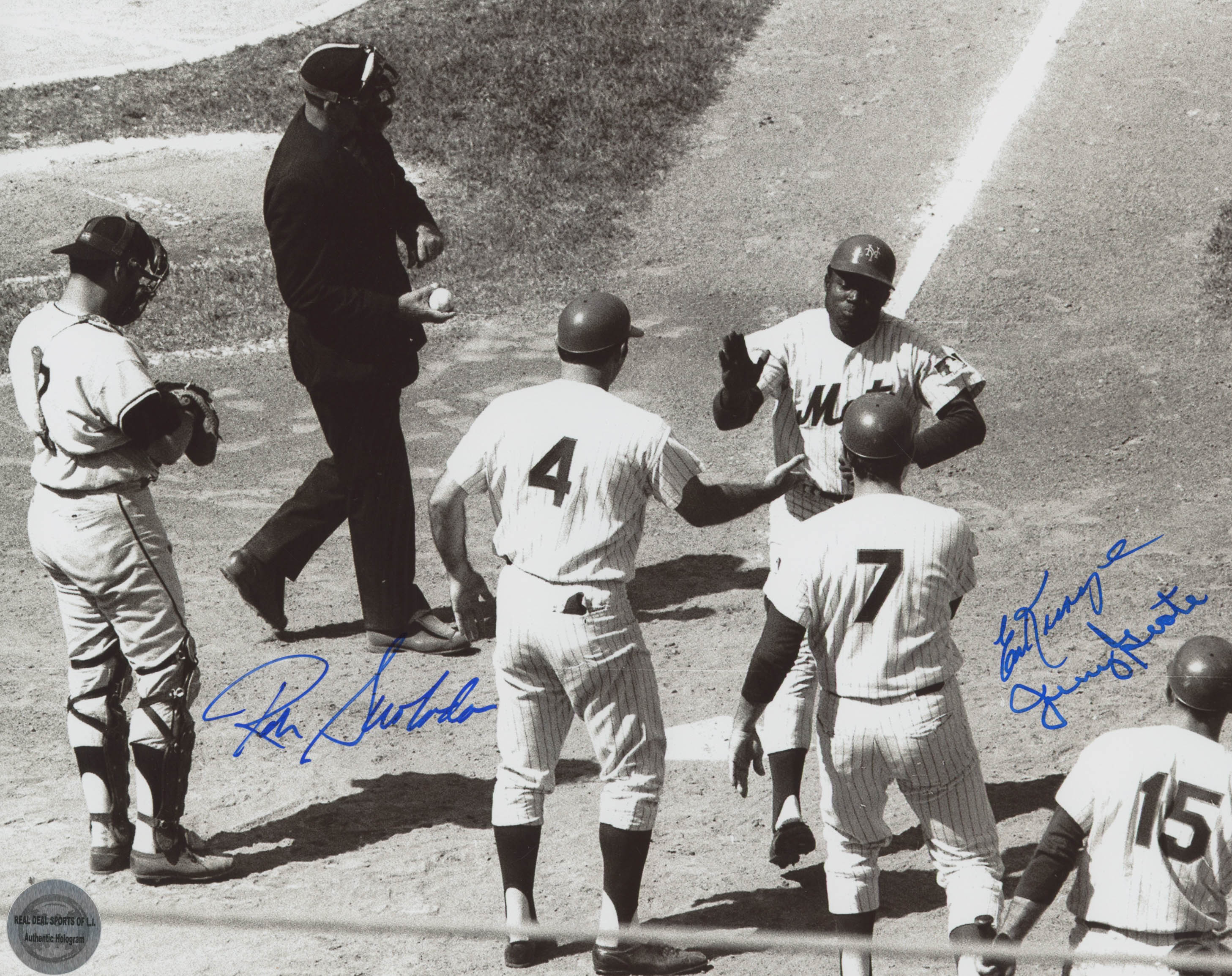 Photo measures 8" x 10" and has been hand-signed in blue felt-tip pen by Ron Swoboda (New York Mets), Ed Kranepool (New York Mets), and Jerry Grote (New York Mets).