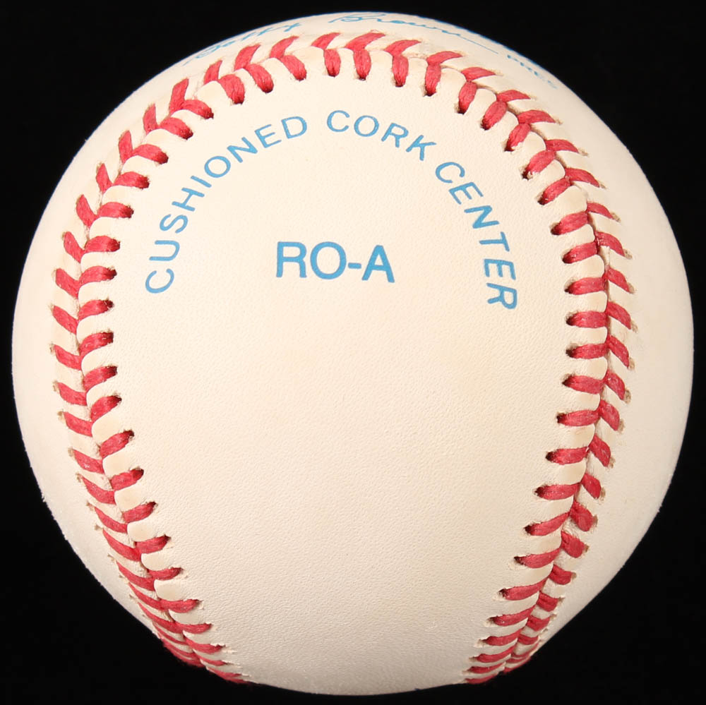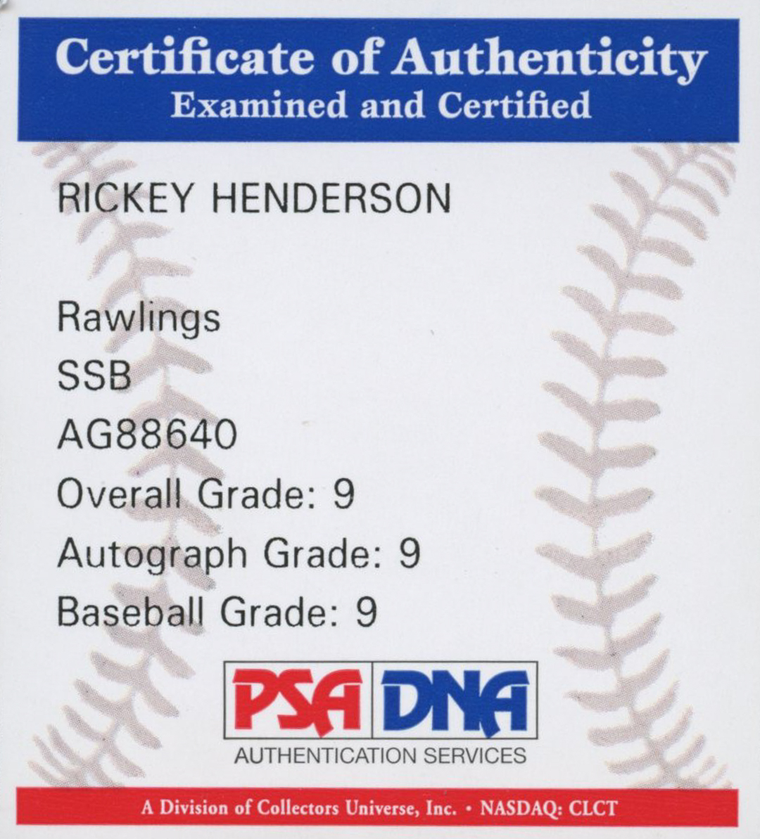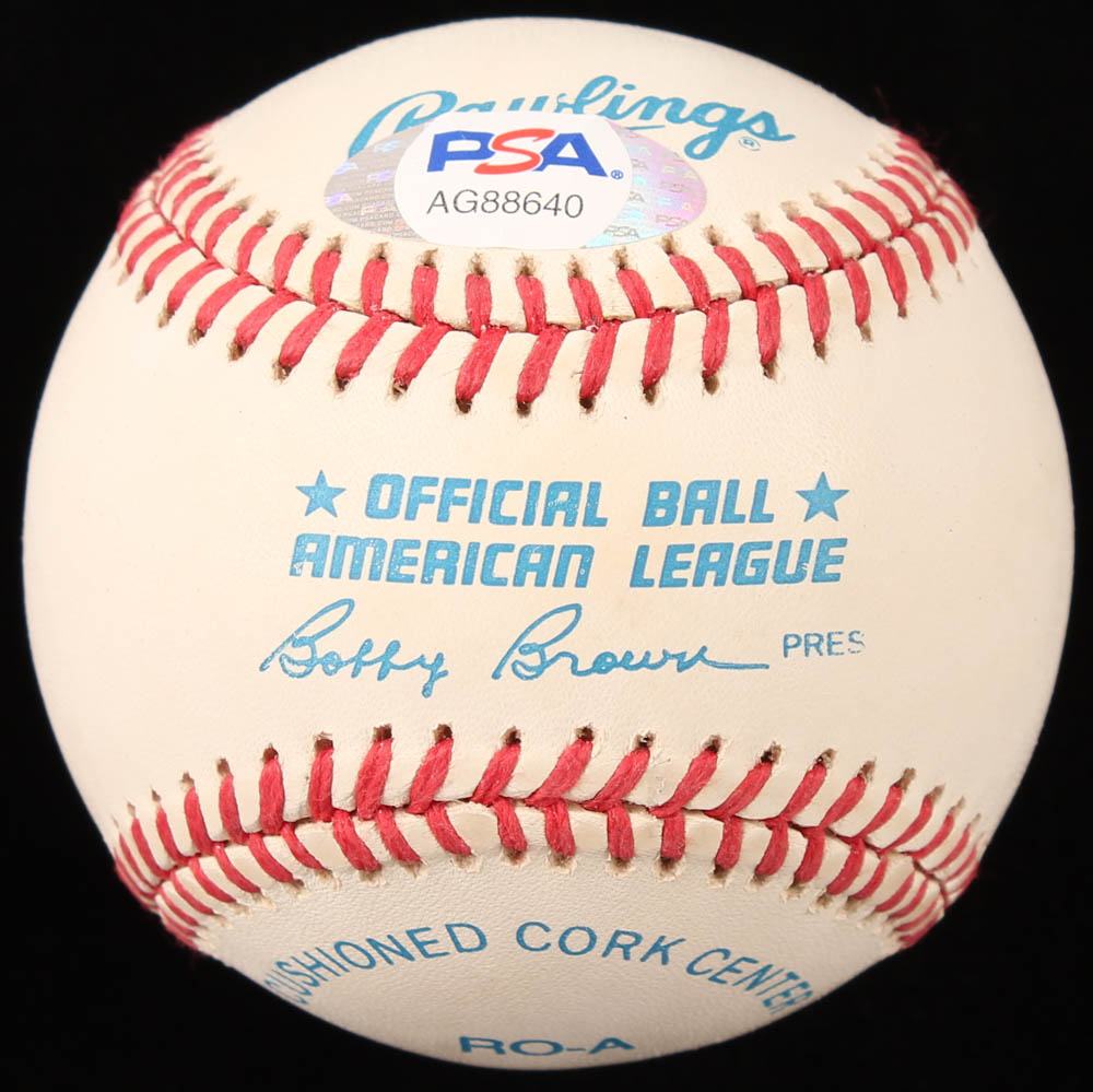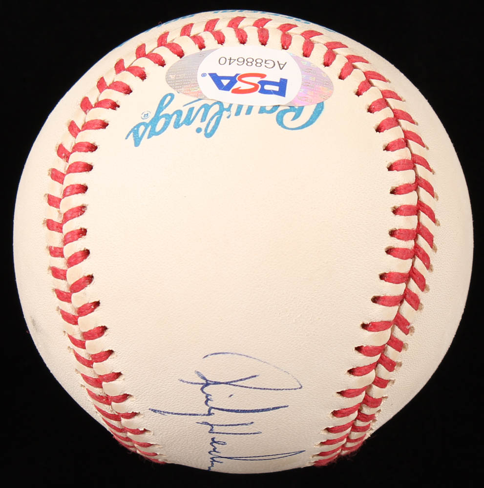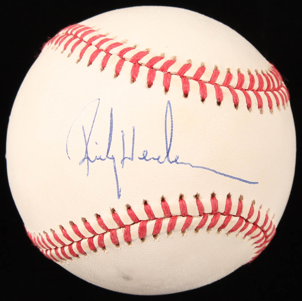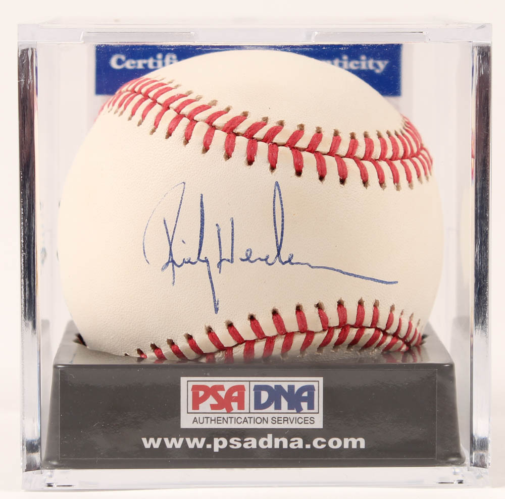 Rawlings Official American League Baseball has been hand-signed in blue ink pen by Rickey Henderson (Oakland Athletics, HOF). The baseball has been given an overall grade of (PSA) 9. Please see photos for details regarding the condition of the baseball.