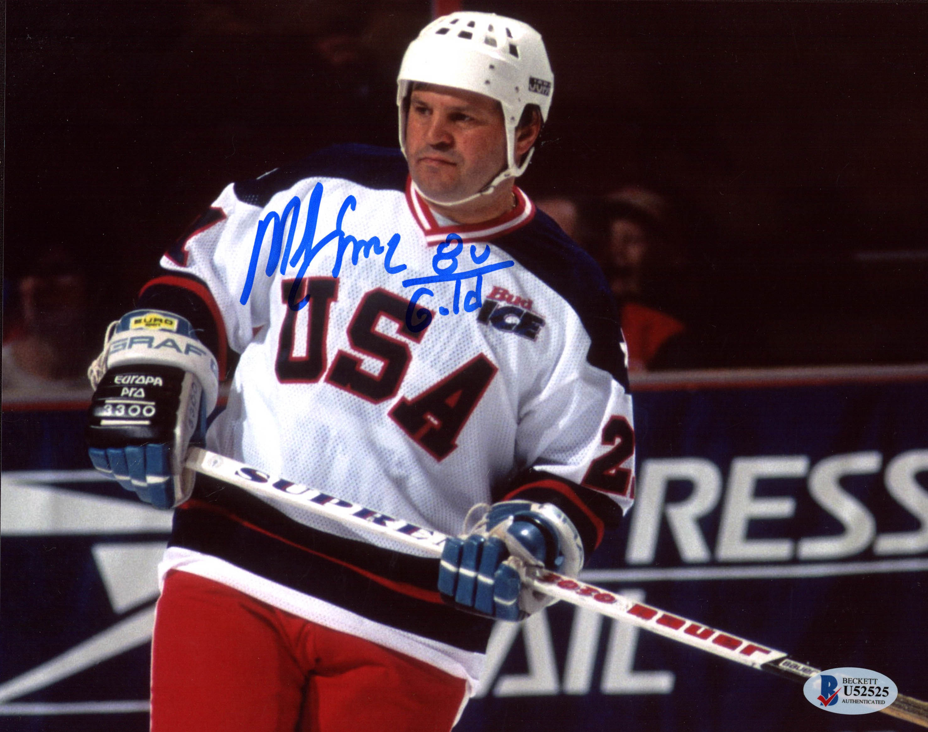 Photo measures 8" x 10" in size and has been hand-signed in blue felt-tip pen by Mike Eruzione. (Team USA)