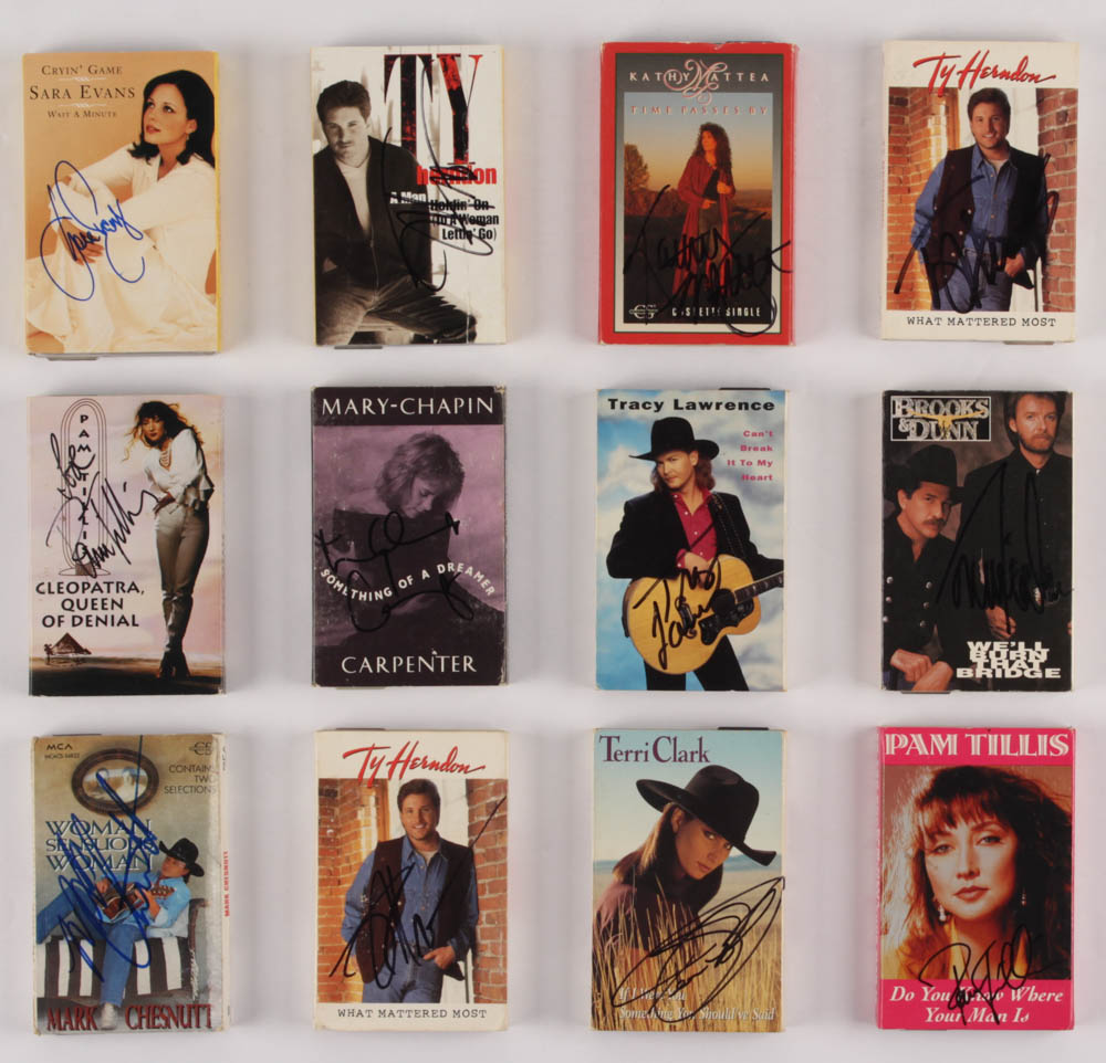 Lot includes all (12) cassette tapes shown. Tapes have been hand-signed by Pam Tillis, Ty Herndon, Sara Evans, Ronnie Dunn, Tracy Lawrence, Mark Chesnutt, Kathy Mattea, Mary Chapin Carpenter, and Terri Clark.