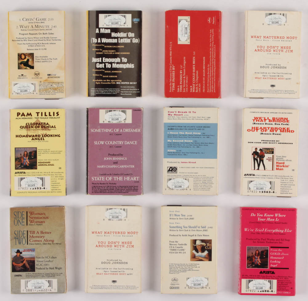 Lot Of (12) Signed Cassette Tapes with Pam Tillis, Ty Herndon, Sara Evans, Ronnie Dunn, Tracy Lawrence, Mark Chesnutt, Kathy Mattea, Mary Chapin Carpenter, & Terri Clark (JSA)