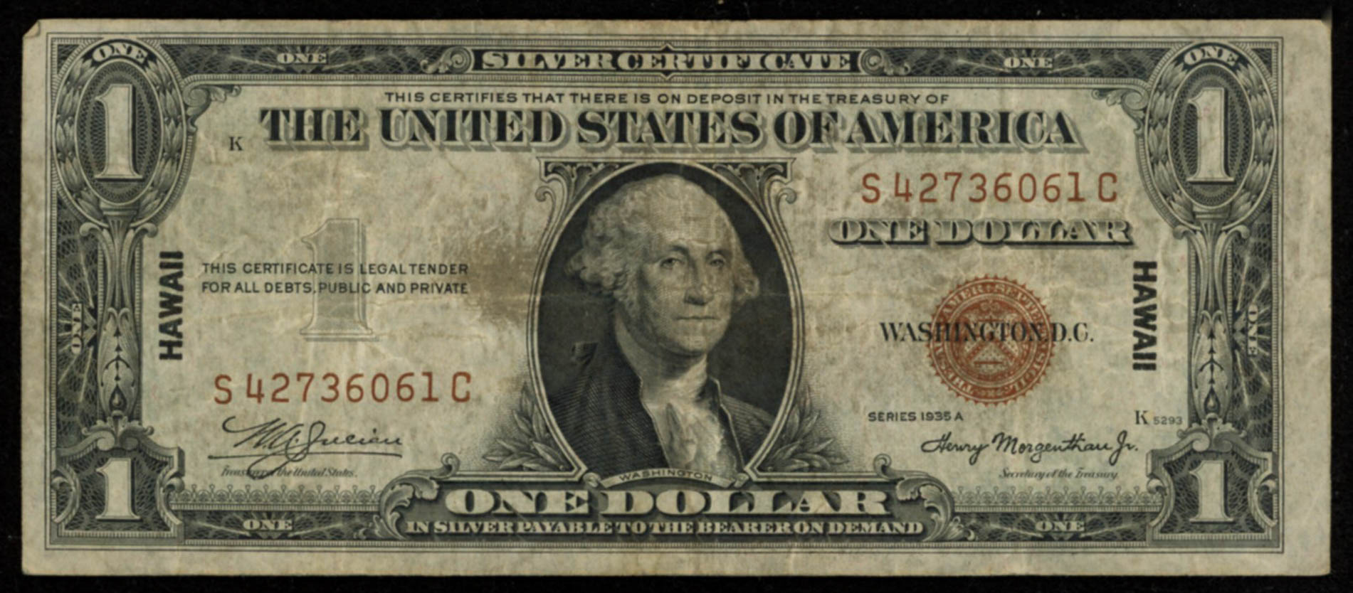 1935-A $1 One Dollar Hawaii Brown Seal Silver Certificate Bank Note Bill