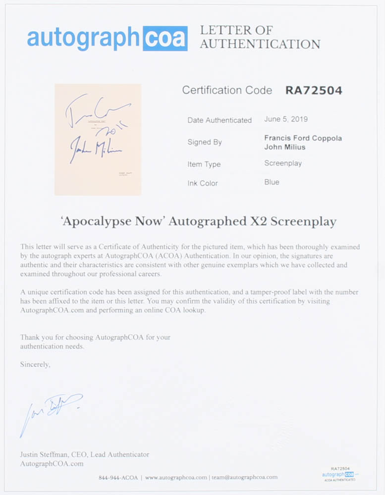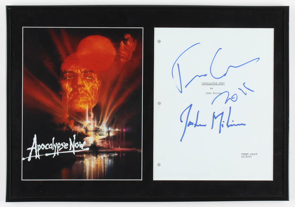 Custom framed display measures 13.5" x 19.5" in size and features a replica "Apocalypse Now" script cover that has been hand-signed in blue felt-tip pen by Francis Ford Coppola (Director) and John Milius (Writer). Please see photos for more details regarding the condition of the display.