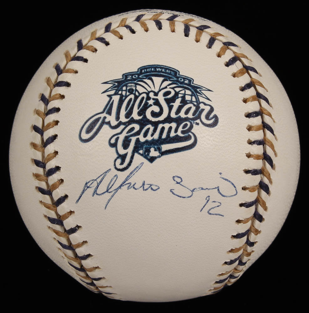 Rawlings Official 2002 All-Star Game baseball. Hand-signed in blue ink pen by Alfonso Soriano (New York Yankees).