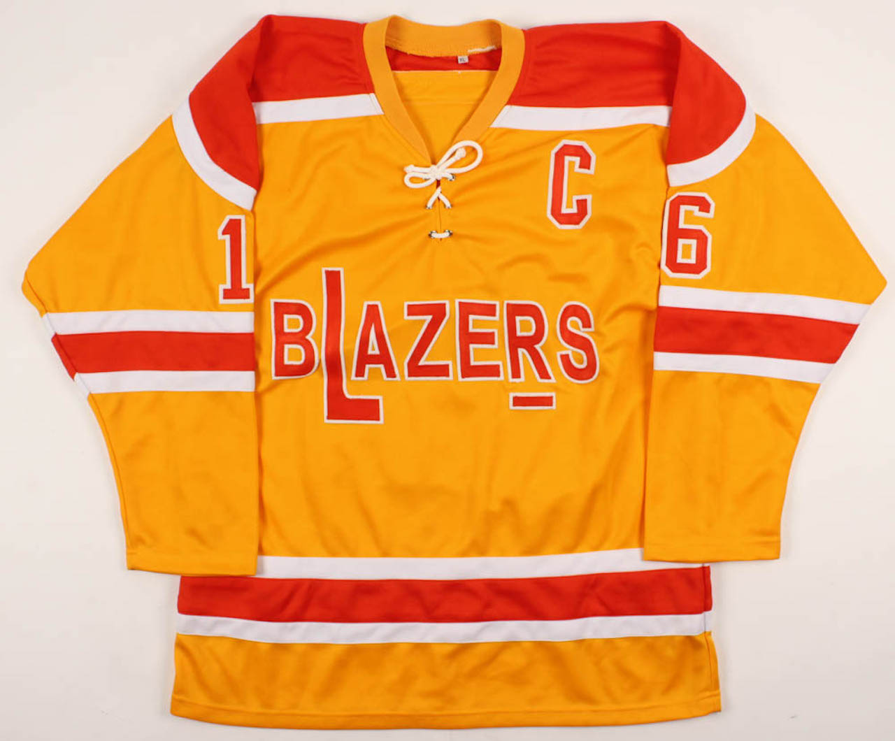 Custom on-ice style jersey. Everything sewn on, size XL. Hand-signed in silver paint-pen by Derek Sanderson (Philadelphia Blazers).