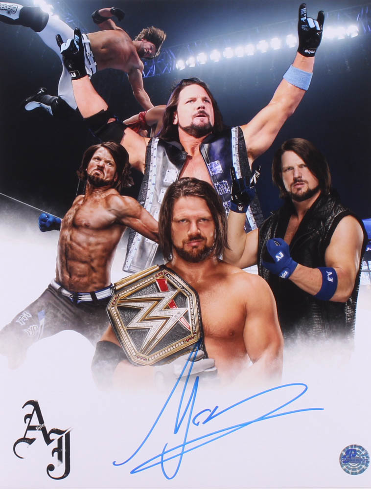 Photo measures 11" x 14" in size and has been hand-signed in blue felt-tip pen by A.J. Styles.