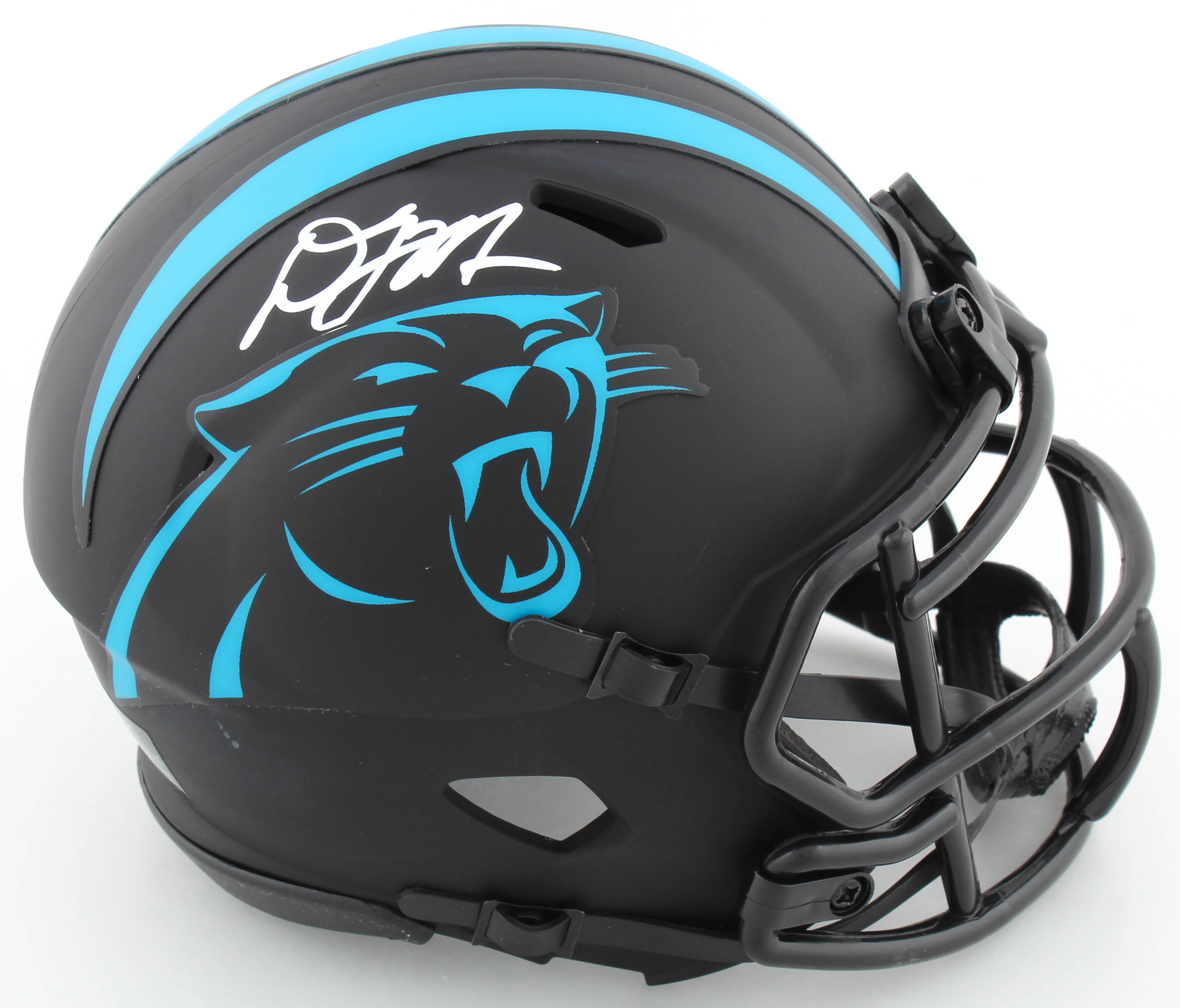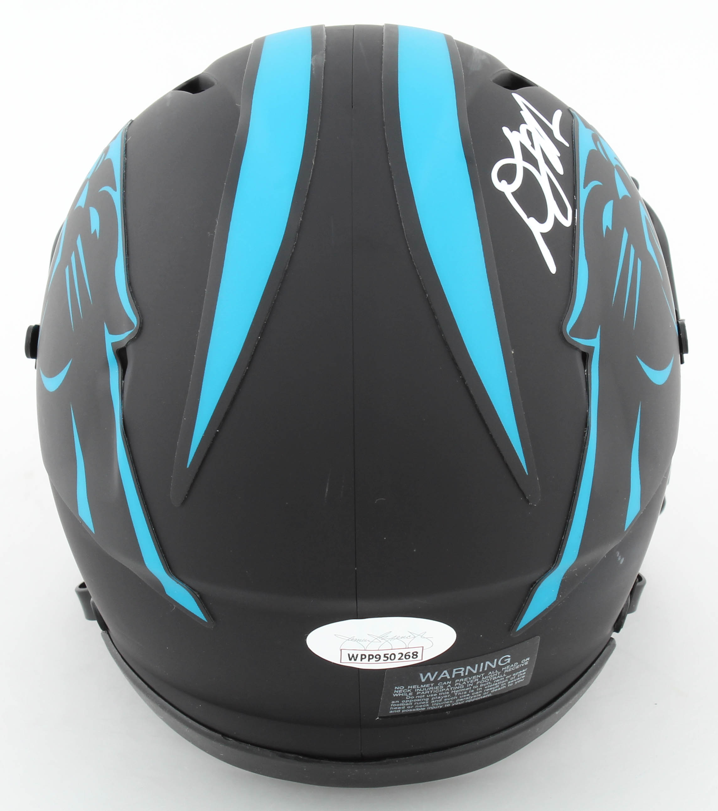Riddell Carolina Panthers Eclipse Alternate Speed mini helmet. Hand-signed in white paint pen by D. J. Moore.