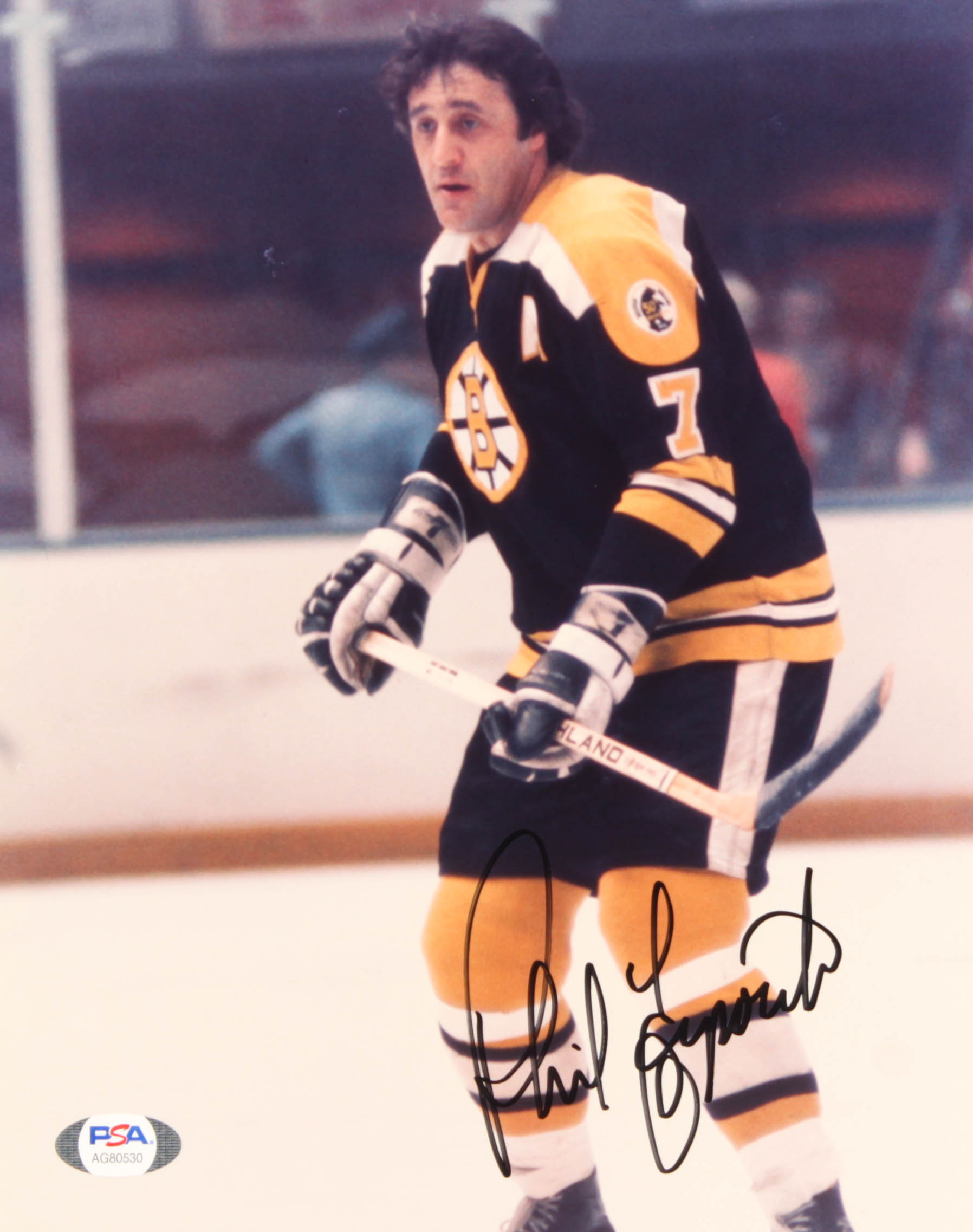 Photo measures 8" x 10" in size and has been hand-signed in black felt-tip pen by Phil Esposito (Boston Bruins, HOF).