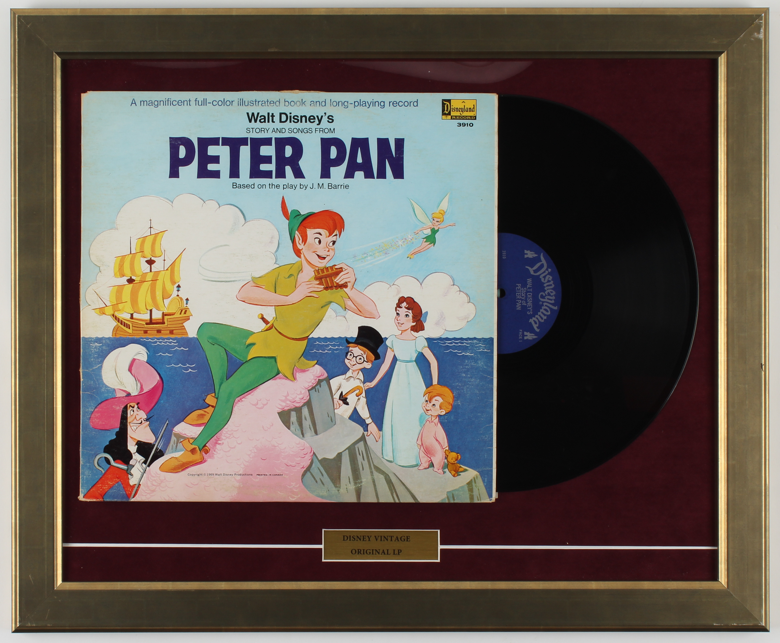 Custom frame measures 18.5" x 22.5" in size and features a 1969 original LP vinyl record album of Walt Disney's "Peter Pan". Please note, frame includes vinyl record.