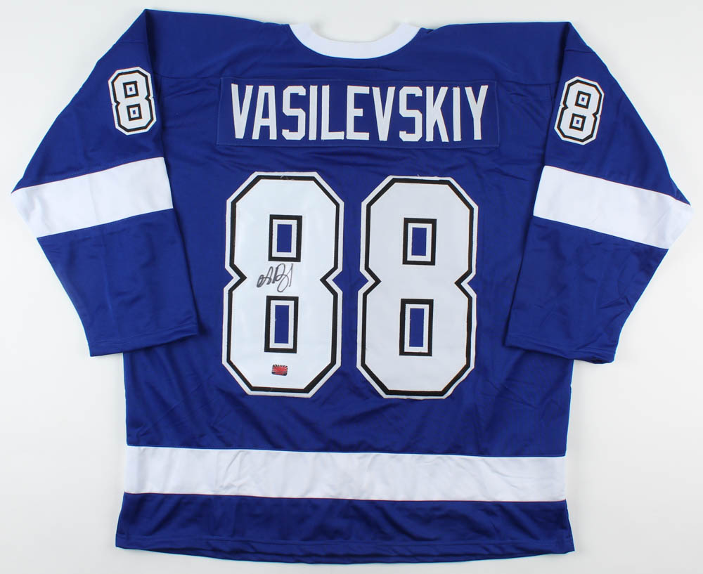 Custom on-ice style jersey. Everything is sewn on, size XL. Hand-signed in black felt-tip pen by Andrei Vasilevskiy.
