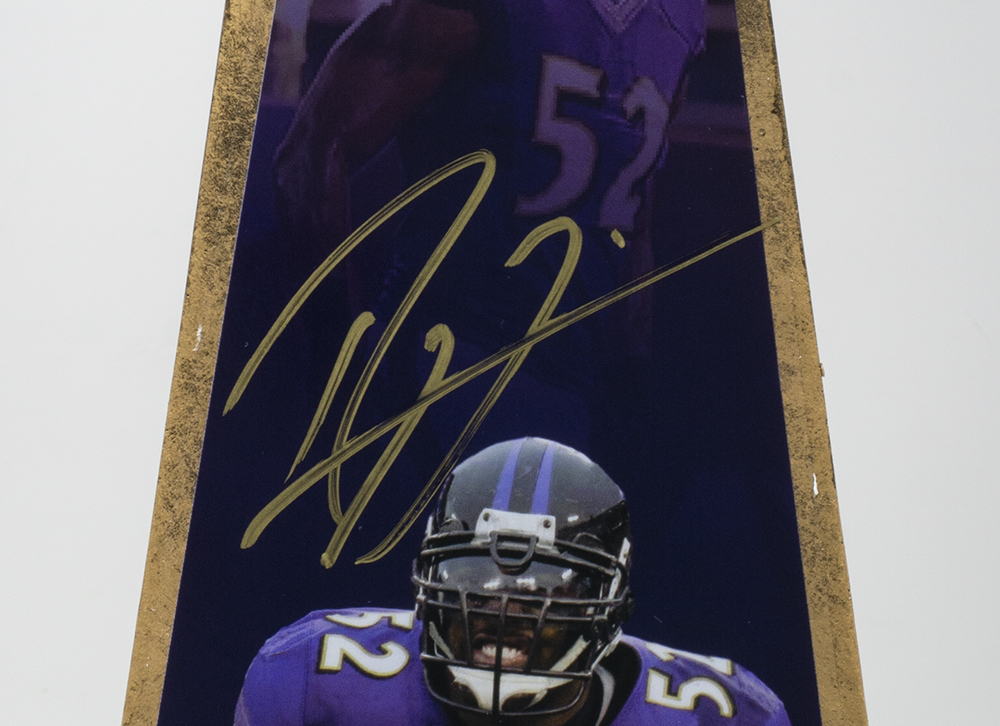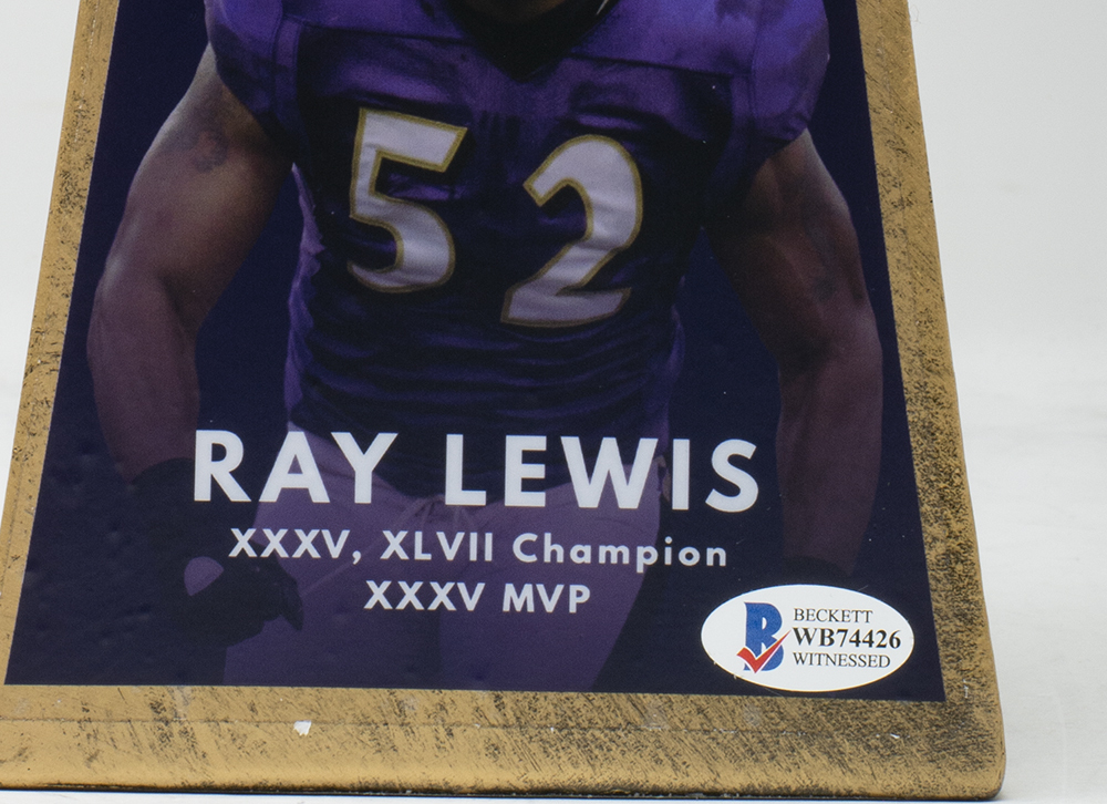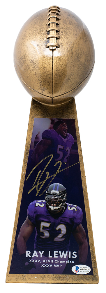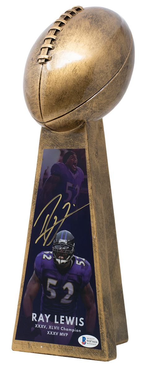 Trophy measures approximately 15" in height and has been hand-signed by Ray Lewis (Baltimore Ravens, HOF).