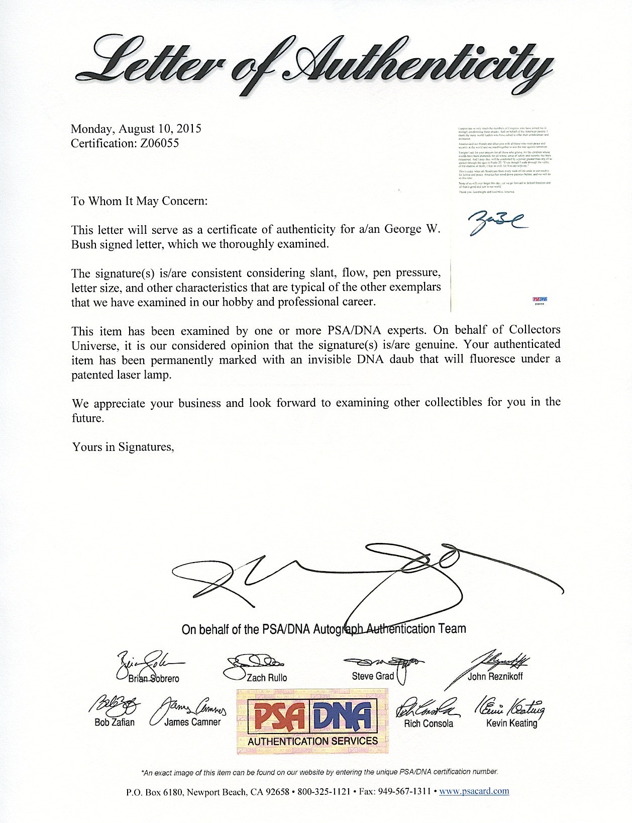 Speech replica is displayed on two sheets each measuring approximately 4.75" x 8" in size. The second sheet has been hand-signed in black felt-tip pen by President George W. Bush. The autograph includes an official PSA/DNA hologram and matching LOA for authenticity purposes.